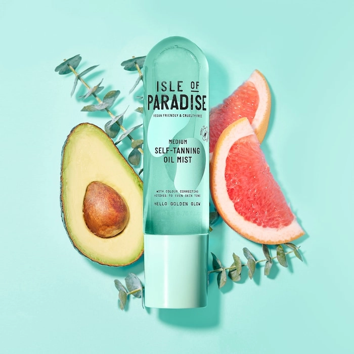 Product Description: Isle of Paradise Self Tan Oil Mist is a bi-phase self-tanning body oil that is supercharged with three hydrating heroes—shake to awake skin paradise. When shaken, powerful actives hyaluronic acid, glycerin, and squalane, plus a vitamin-rich sea kelp base combine with seven nourishing oils including argan, grape seed, and avocado to lock in moisture for up to 24 hours. Self-Tanning Oil Mist provides your most natural-looking, longest-lasting glow, guaranteed. Plus, the easy-to-apply mister gives a streamlined, streak-free, full-body application in under two minutes. Beauty Collection.
