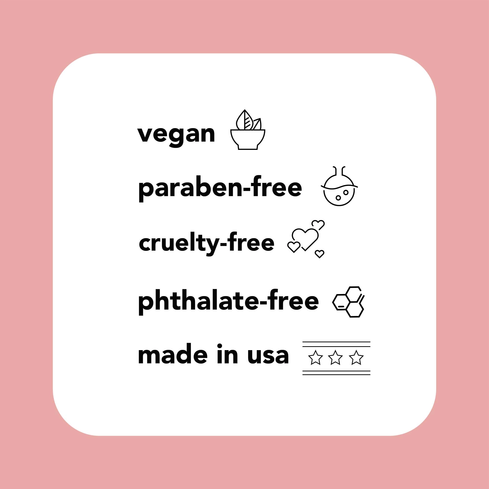 It is free of parabens, formaldehydes, formaldehyde-releasing agents, phthalates, mineral oil, retinyl palmitate, oxybenzone, coal tar, hydroquinone, sulfates SLS & SLES, triclocarban, triclosan, and contains less than one percent synthetic fragrance. It is also vegan, gluten-free, cruelty-free, and comes in recyclable packaging.