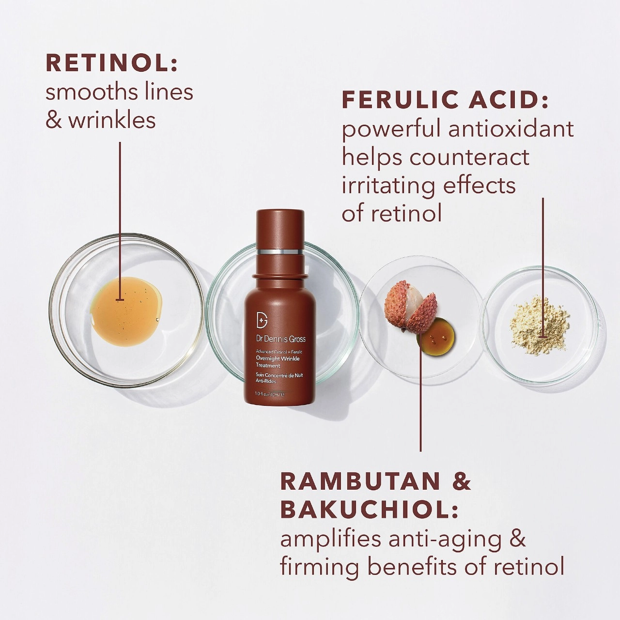 This product contains Retinol, a vitamin A derivative that supports collagen production, improves fine lines and wrinkles, and fades dark spots. It also contains Bakuchiol, an active derived from the babchi plant that has the same efficacy as retinol without redness or irritation. Rambutan, a gentle botanical active, targets fine lines and wrinkles while improving skin elasticity.