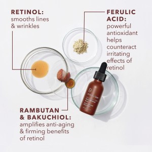 For stubborn blemish concerns, pair this serum with the Advanced Retinol + Ferulic Overnight Texture Renewal Peel (sold separately) to smooth and resurface the skin. The retinol in this serum supports collagen production, reverses visible signs of photoaging, and improves the appearance of fine lines and wrinkles. Bakuchiol, a retinol-like botanical active, provides the same level of efficacy as retinol without redness or irritation. Rambutan, a gentle botanical active, targets fine lines and wrinkles while supporting skin’s elasticity.