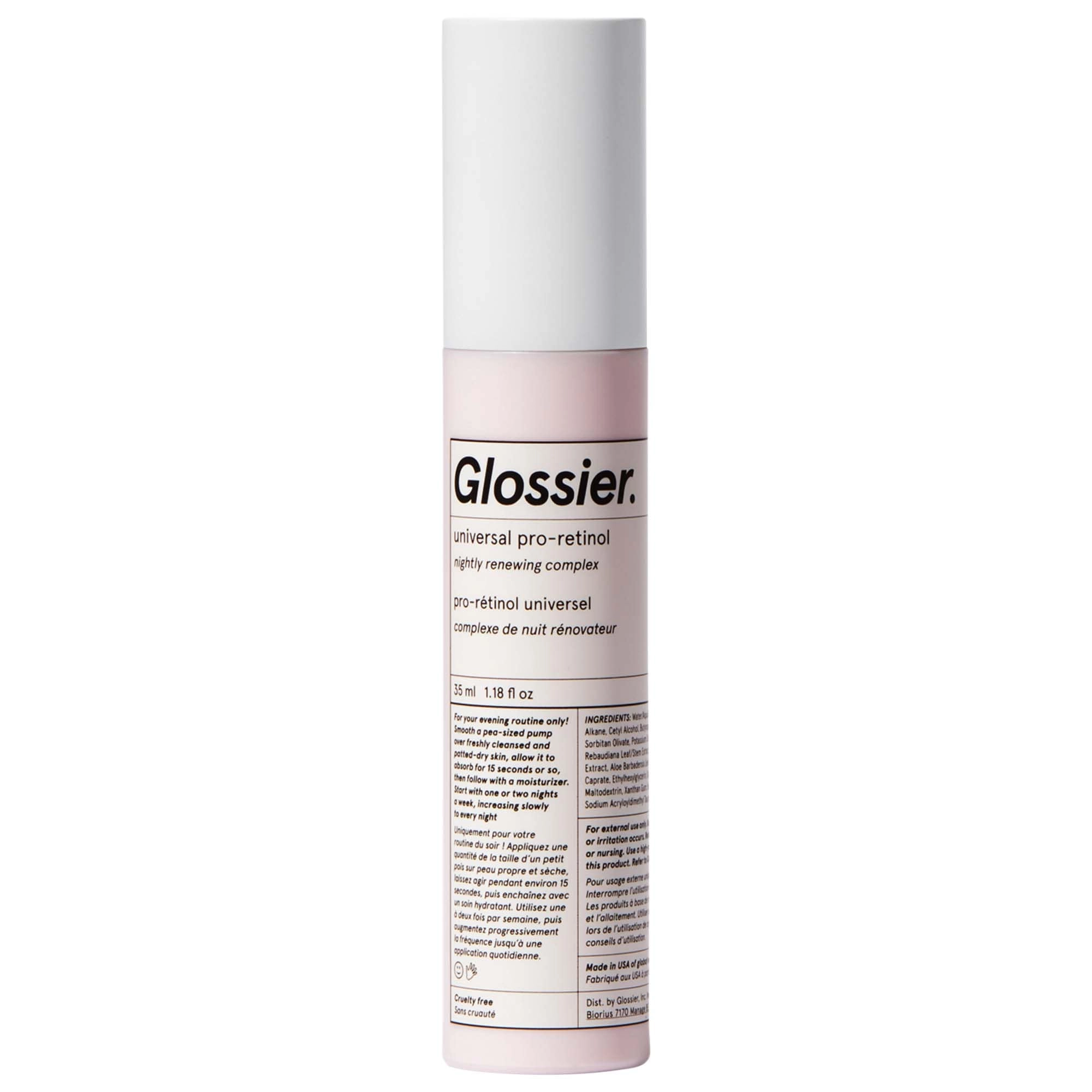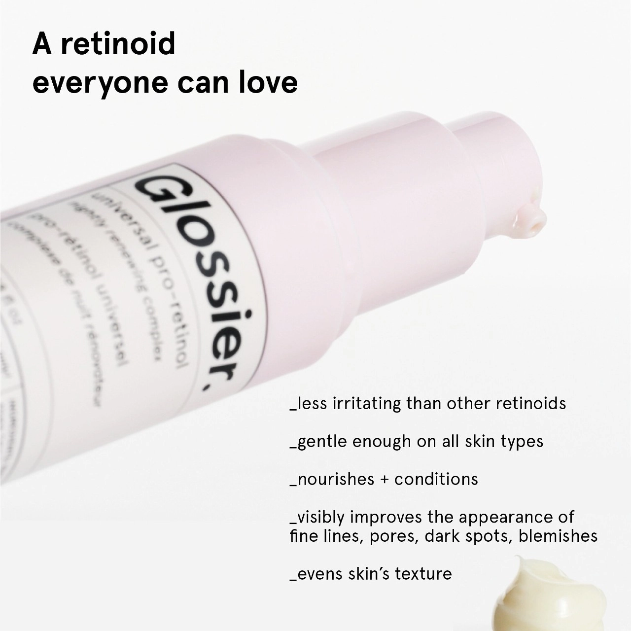 Experience the transformative power of Glossier Universal Pro-Retinol Overnight Renewing Treatment. This lightweight cream is formulated with 0.5% pro-retinol, a pure retinol and fatty acid hybrid, to deliver serious results without the usual downsides of irritation, dryness, and peeling. Suitable for all skin types, this vegan treatment visibly improves fine lines, dark spots, texture, and tone while nourishing the skin.