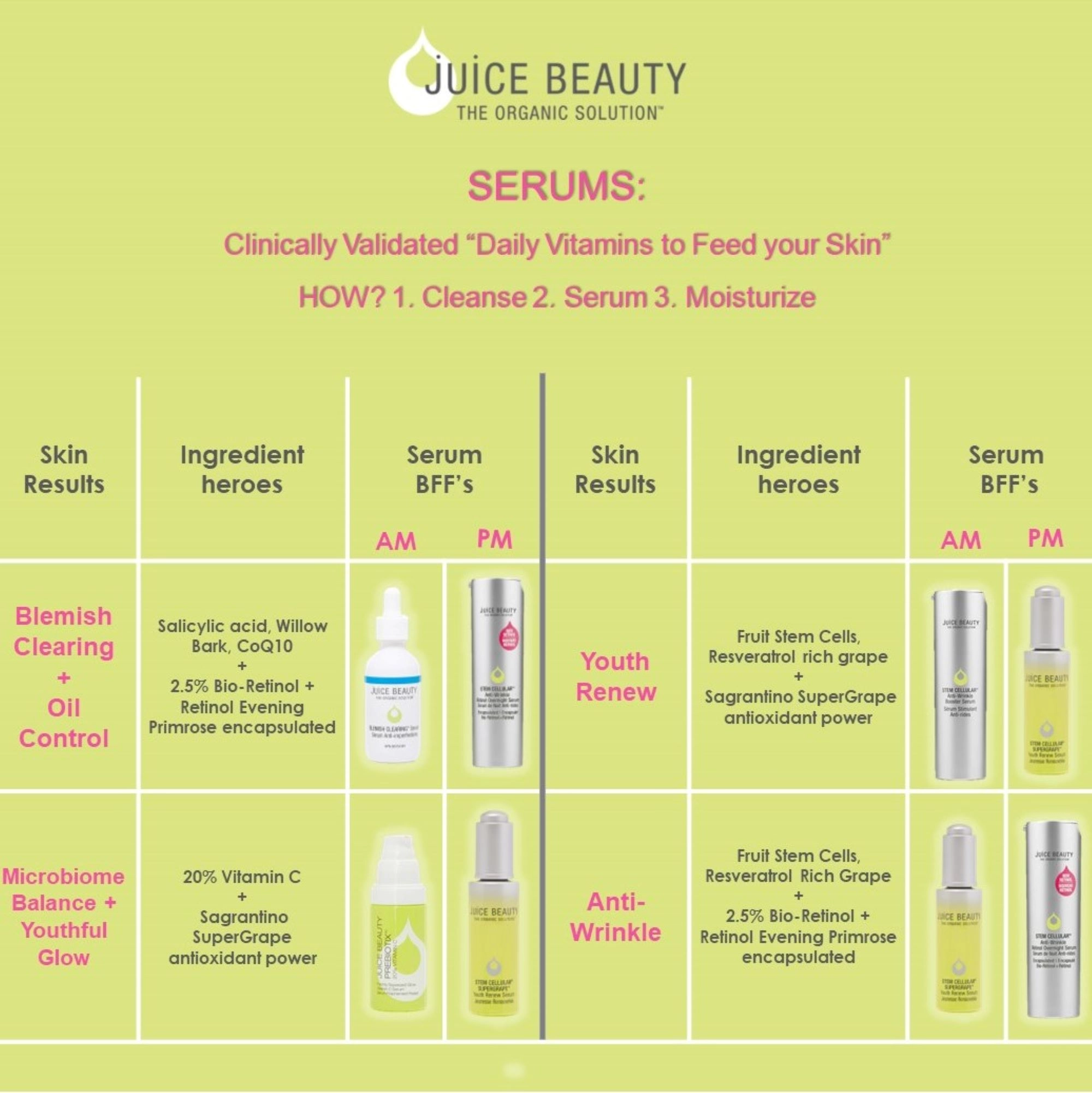 To achieve optimal results, apply Juice Beauty STEM CELLULAR™ Anti-Wrinkle Booster Serum generously to cleansed face, neck, and décolleté. For best results, follow with Juice Beauty’s STEM CELLULAR™ Eye Treatment and STEM CELLULAR™ CC Cream or STEM CELLULAR™ Anti-Wrinkle Moisturizer (sold separately).