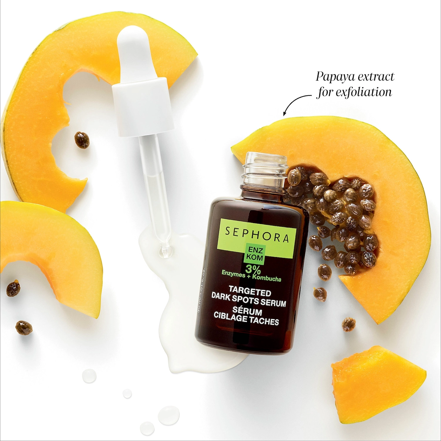 To use the SEPHORA COLLECTION Targeted Dark Spots Serum with Enzymes, apply three or four drops every morning and evening to your entire clean, dry face and neck. Gently massage the serum into your skin. Follow with your usual moisturizing cream for best results.