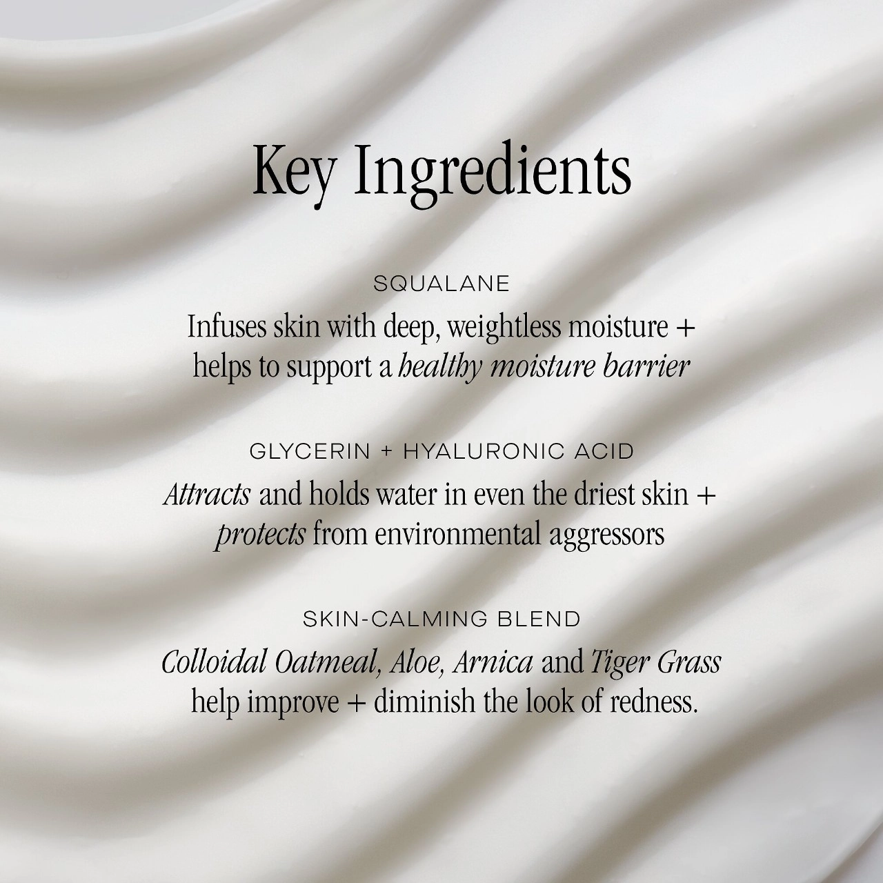 Water/Aqua/Eau, Propanediol, Squalane, Glycerin, Cetyl Ethylhexanoate, Aloe Barbadensis Leaf Juice, Ammonium Acryloyldimethyltaurate/VP Copolymer, Polyester-5, Sodium Hyaluronate, Avena Sativa (Oat) Kernel Flour, Sodium PCA, Panthenol, Ceramide NP, Arnica Montana Flower Extract, Laminaria Digitata Extract, Centella Asiatica Extract, Palmitoyl Tripeptide-38, Niacinamide, Acetyl Glucosamine, Arginine, Aspartic Acid, PCA, Glycine, Alanine, Serine, Valine, Proline, Threonine, Isoleucine, Phenylalanine, Histidine, Sodium Lactate, Caprylhydroxamic Acid, Glyceryl Stearate, Disodium EDTA, Sodium Hydroxide, Polyglyceryl-3 Methylglucose Distearate, Sodium Benzoate, Citric Acid, Hydroxypropyl Cyclodextrin, Xanthan Gum, Potassium Sorbate, 1,2-Hexanediol, Propylene Glycol.