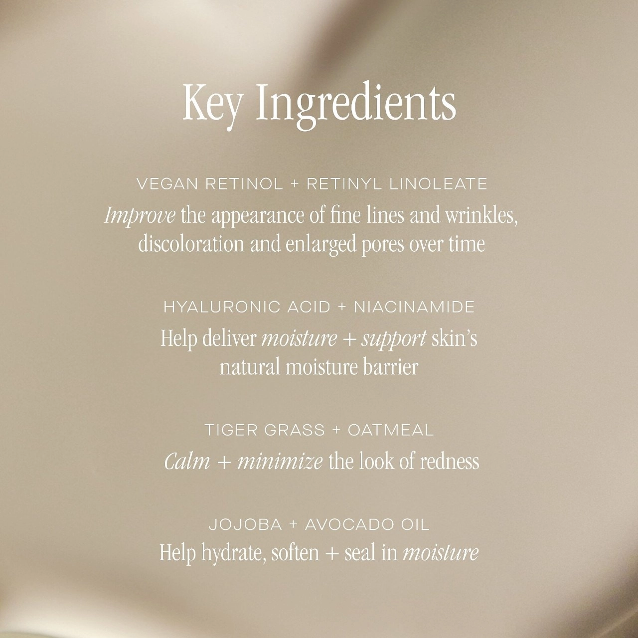 – Vegan Retinyl Linoleate: Improves the look of fine lines and wrinkles, discoloration, and enlarged pores.