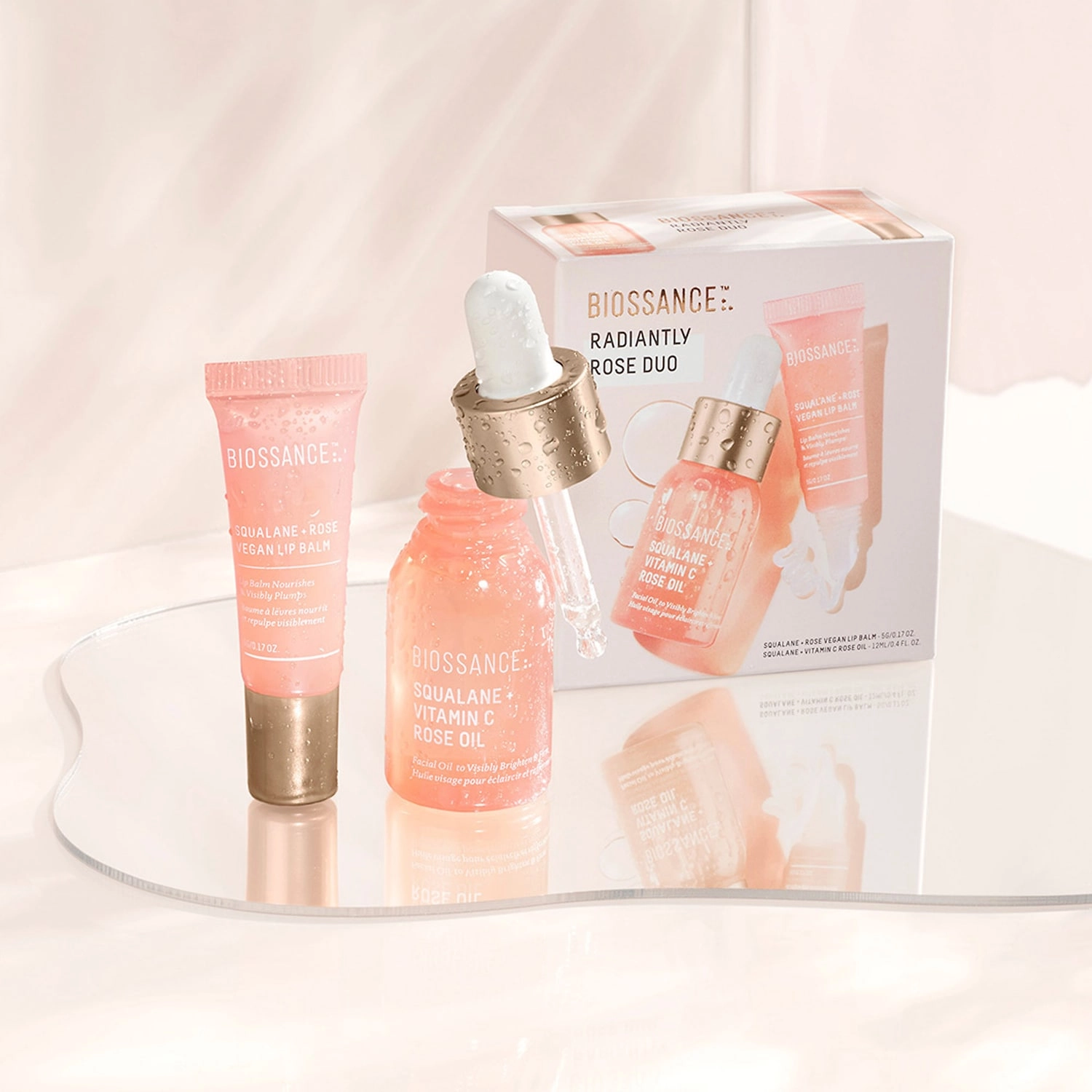 Hydrate and brighten your skin with the Biossance Radiantly Rose Duo Set. This set includes a luxurious face oil and a cult-favorite lip balm, both winners of the Allure Best of Beauty award. The face oil features oil-soluble Vitamin C, a stable form of Vitamin C that visibly brightens and firms your skin. It also contains a blend of ceramides, hyaluronic acid, and sugarcane-derived squalane to intensely moisturize, smooth, and plump your lips. Both products are vegan, gluten-free, cruelty-free, and come in recyclable packaging.