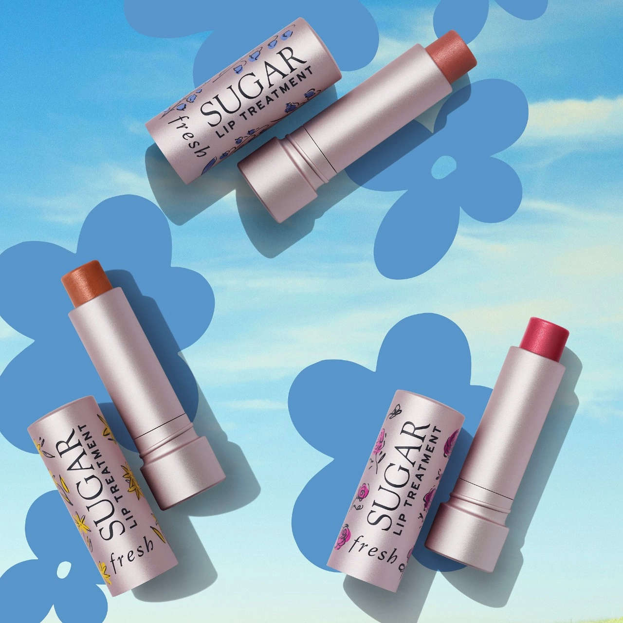 3 x 0.15 oz/4.3 g Sugar Lip Balm Hydrating Treatments in Lily Luster (shimmery mauve), Radiant Rose (shimmery fuchsia), Dewy Daisy (shimmery blush)
