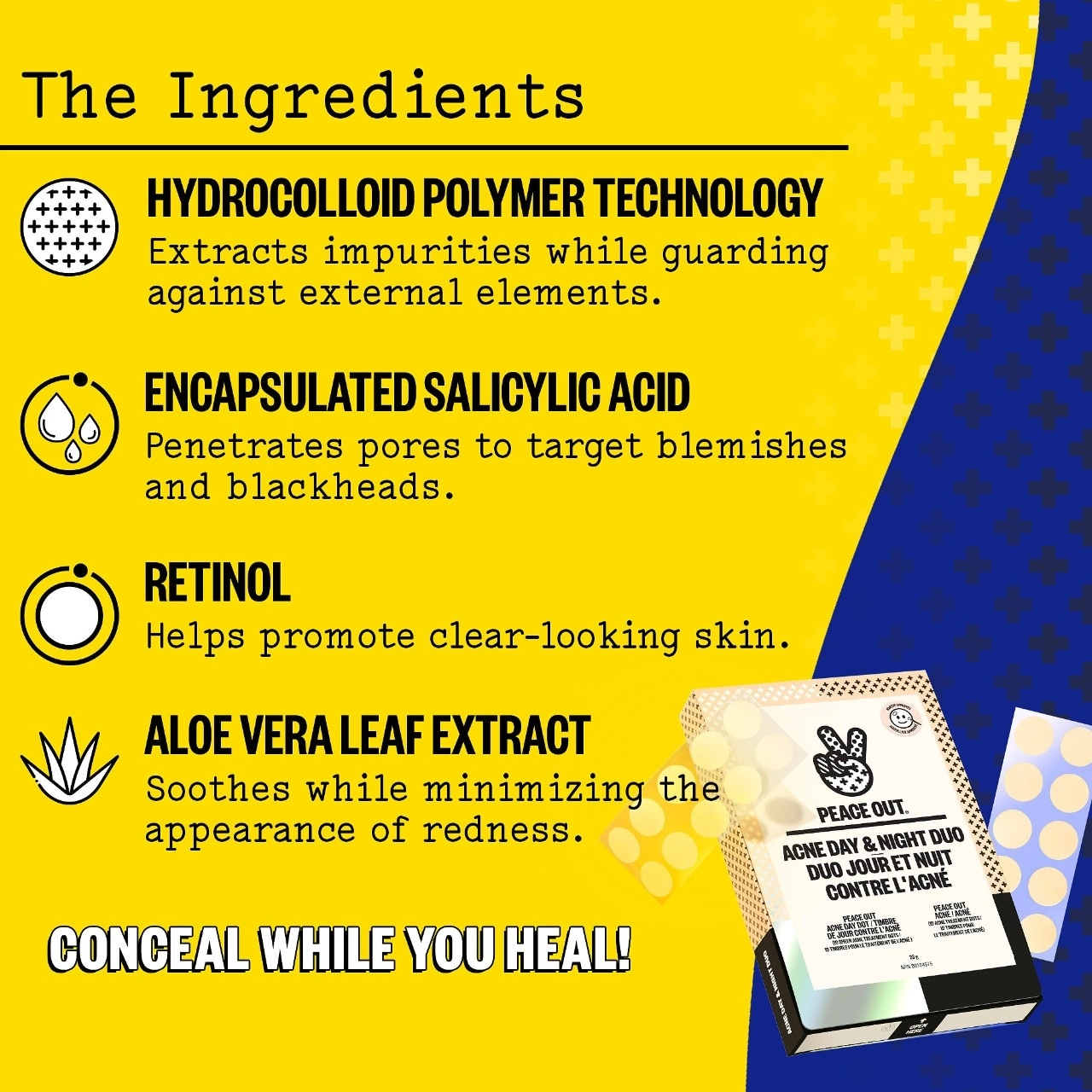 Fight acne day and night with the Peace Out Acne Salicylic Acid Day & Night Duo. This powerful duo includes 10 Acne Day Dots and 10 Acne Healing Dots. These hydrocolloid patches are formulated with encapsulated salicylic acid, retinol, and aloe vera extract to target blemishes, promote clear-looking skin, and soothe dryness. Whether you’re dealing with pesky pimples or stubborn breakouts, this duo has got you covered.