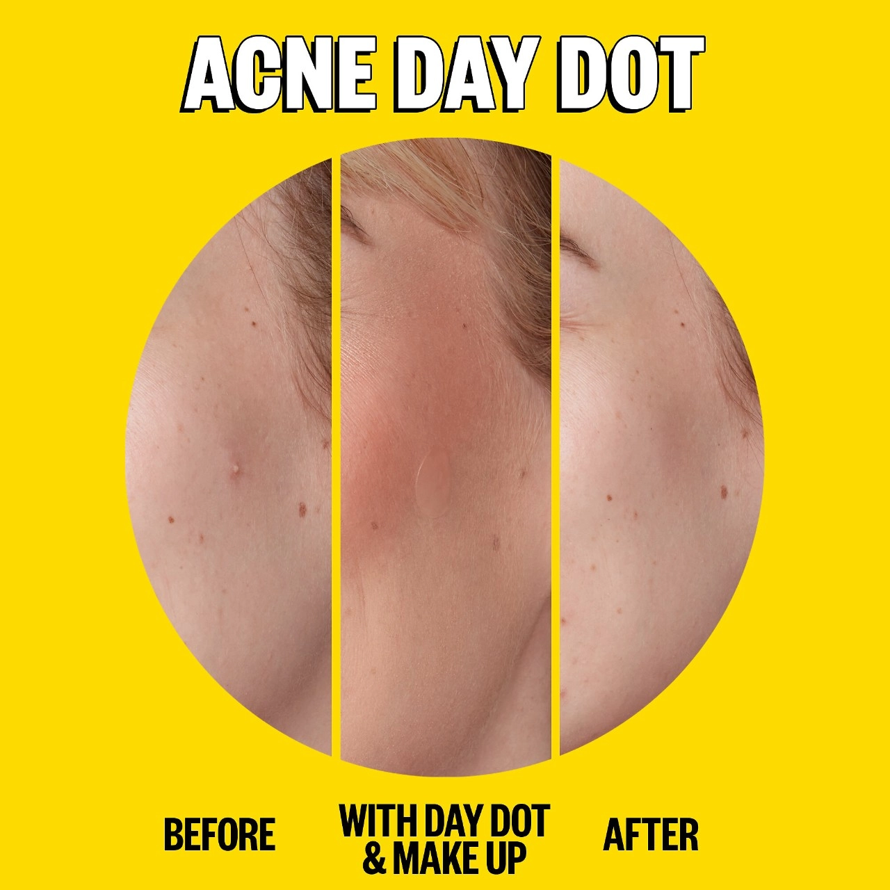 - After cleansing, apply a Salicylic Acid Acne Day Dot, tacky side down, directly on your blemish.