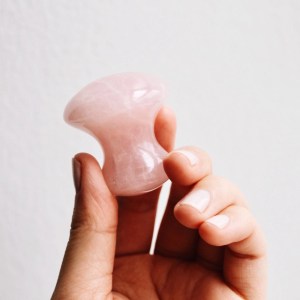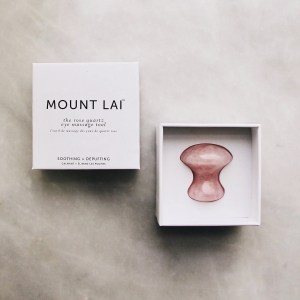- After applying your favorite eye serum or cream, gently slide the Mount Lai De-Puffing Rose Quartz Eye Treatment Tool around the under-eye area.