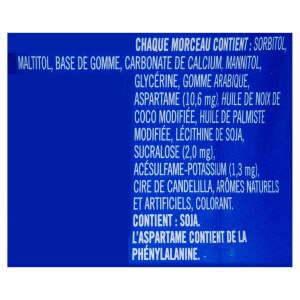 Sorbitol, Maltitol, Gum base, Calcium carbonate, Mannitol, Glycerin, Gum Arabic, Aspartame, Soy lecithin, Sucralose, Acesulfame-potassium, Cadelilla wax, Natural and artificial flavor, Titanium dioxide. Contains: Soy. Aspartame contains phenylalanine.