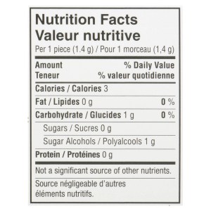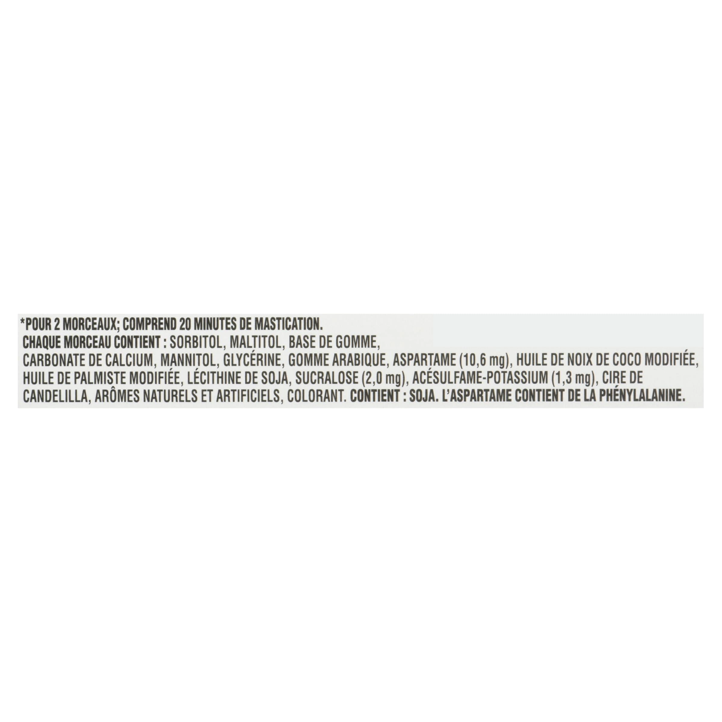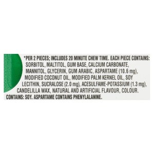 Sorbitol, Maltitol, Gum Base, Calcium Carbonate, Mannitol, Glycerin, Gum Arabic, Aspartame (10.6 mg), Modified Coconut Oil, Modified Palm Kernel Oil, Soy Lecithin, Sucralose (2.0 mg), Acesulfame-Potassium (1.3 mg), Candelilla Wax, Natural and Artificial Flavor, Color.