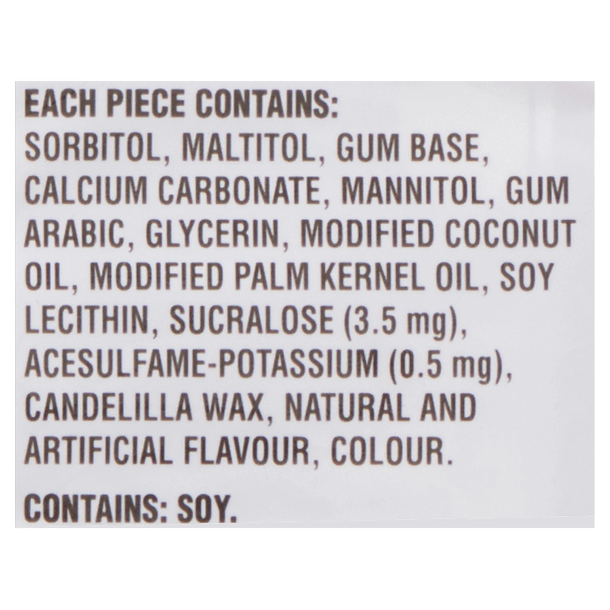 Ingredients: Sorbitol, Maltitol, Gum base, Calcium carbonate, Mannitol, Gum Arabic, Glycerin, Soy lecithin, Sucralose, Acesulfame-potassium, Candelilla wax, Natural and artificial flavor, Allura red, Titanium dioxide, Indigotine. Contains: Soy. 7.0 mg Sucralose, 1.0 mg Acesulfame-potassium per 2 pieces.
