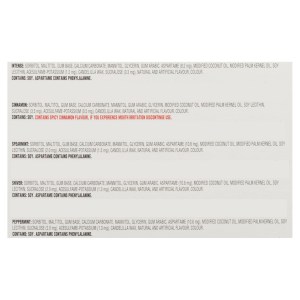 INTENSE: SORBITOL, MALTITOL, GUM BASE, CALCIUM CARBONATE, MANNITOL, GLYCERIN, GUM ARABIC, ASPARTAME (8.2 mg), MODIFIED COCONUT OIL, MODIFIED PALM KERNEL OIL, SOY LECITHIN, ACESULFAME-POTASSIUM (1.2 mg), CANDELILLA WAX, SUCRALOSE (0.3 mg), NATURAL AND ARTIFICIAL FLAVOR, COLOR. CONTAINS: SOY. ASPARTAME CONTAINS PHENYLALANINE. CINNAMON: SORBITOL, MALTITOL, GUM BASE, CALCIUM CARBONATE, MANNITOL, GUM ARABIC, GLYCERIN, MODIFIED COCONUT OIL, MODIFIED PALM KERNEL OIL, SOY LECITHIN, SUCRALOSE (3.5 mg), ACESULFAME-POTASSIUM (0.5 mg), CANDELILLA WAX, NATURAL AND ARTIFICIAL FLAVOR, COLOR. CONTAINS: SOY. CONTAINS SPICY CINNAMON FLAVOR, IF YOU EXPERIENCE MOUTH IRRITATION DISCONTINUE USE. SPEARMINT: SORBITOL, MALTITOL, GUM BASE, CALCIUM CARBONATE, MANNITOL, GLYCERIN, GUM ARABIC, ASPARTAME (10.6 mg), MODIFIED COCONUT OIL, MODIFIED PALM KERNEL OIL, SOY LECITHIN, SUCRALOSE (2.0 mg), ACESULFAME-POTASSIUM (1.3 mg), CANDELILLA WAX, NATURAL AND ARTIFICIAL FLAVOR, COLOR. CONTAINS: SOY. ASPARTAME CONTAINS PHENYLALANINE. SHIVER: SORBITOL, MALTITOL, GUM BASE, CALCIUM CARBONATE, MANNITOL, GLYCERIN, GUM ARABIC, ASPARTAME (10.6 mg), MODIFIED COCONUT OIL, MODIFIED PALM KERNEL OIL, SOY LECITHIN, SUCRALOSE (2.0 mg), ACESULFAME-POTASSIUM (1.3 mg), CANDELILLA WAX, NATURAL AND ARTIFICIAL FLAVOR, COLOR. CONTAINS: SOY. ASPARTAME CONTAINS PHENYLALANINE. PEPPERMINT: SORBITOL, MALTITOL, GUM BASE, CALCIUM CARBONATE, MANNITOL, GLYCERIN, GUM ARABIC, ASPARTAME (10.6 mg), MODIFIED COCONUT OIL, MODIFIED PALM KERNEL OIL, SOY LECITHIN, SUCRALOSE (2.0 mg), ACESULFAME-POTASSIUM (1.3 mg), CANDELILLA WAX, NATURAL AND ARTIFICIAL FLAVOR, COLOR. CONTAINS: SOY. ASPARTAME CONTAINS PHENYLALANINE.