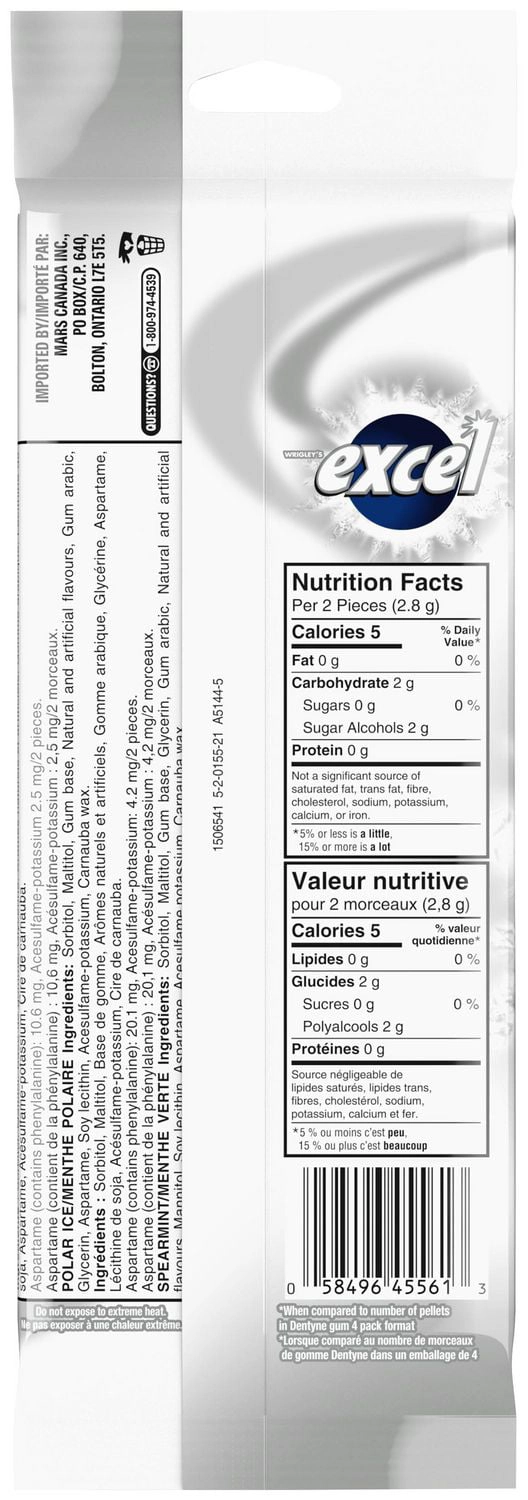 Each piece of Excel Chewing Gum is made with high-quality ingredients, including sorbitol, maltitol, gum base, glycerin, and natural and artificial flavors. The gum also contains gum arabic, soy lecithin, aspartame, acesulfame potassium, and carnauba wax.
