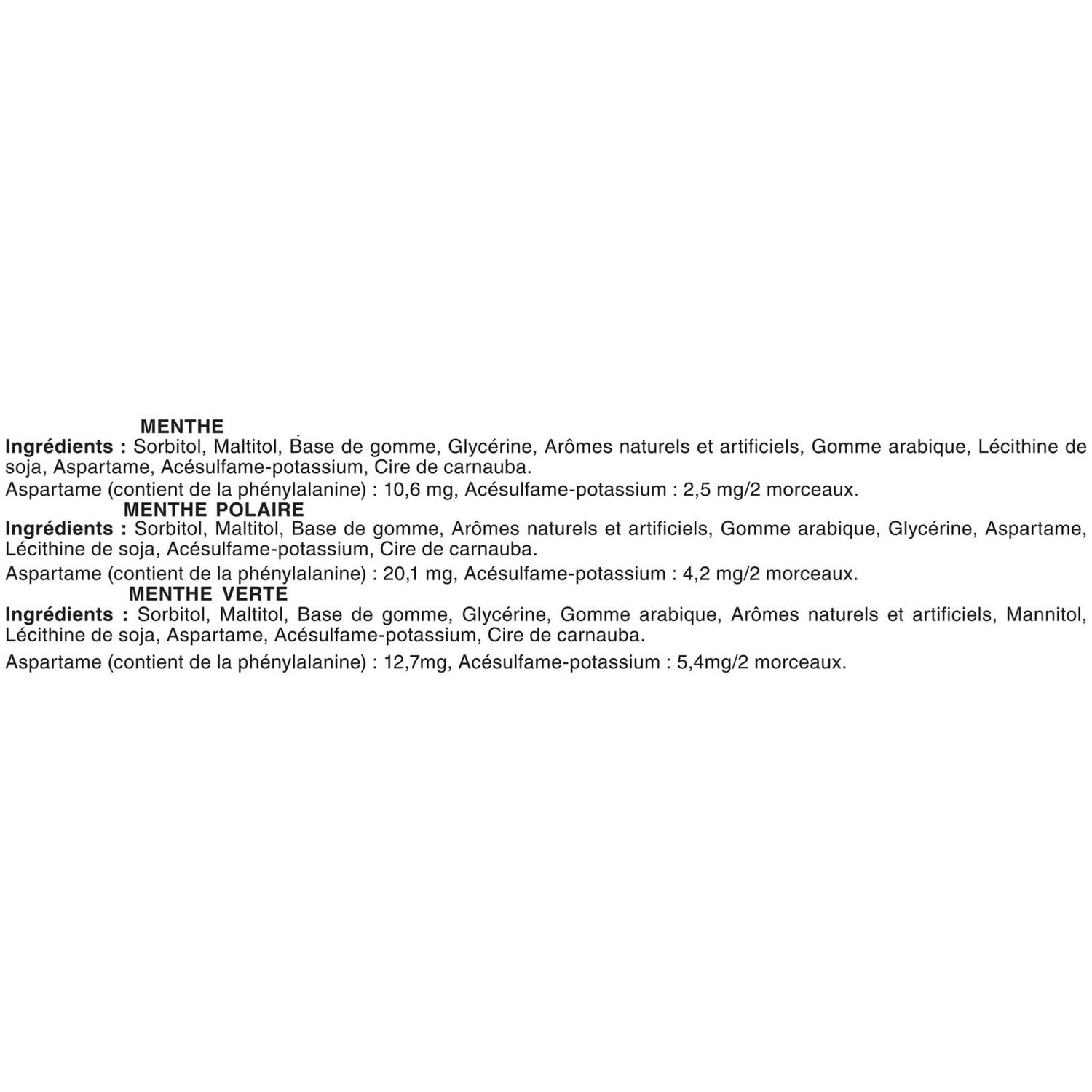 - PEPPERMINT Ingredients: Sorbitol, Maltitol, Gum base, Glycerin, Natural and artificial flavors, Gum arabic, Soy lecithin, Aspartame, Acesulfame potassium, Carnauba wax. Aspartame (contains phenylalanine): 10.6 mg, Acesulfame-potassium 2.5 mg/2 pieces.