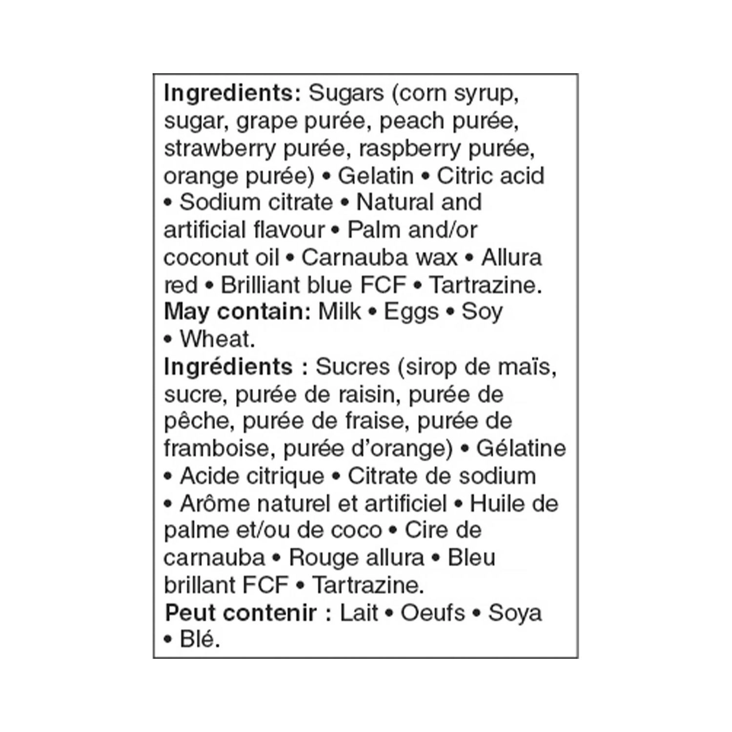 Sugars (corn syrup, sugar, grape purée, peach purée, strawberry purée, raspberry purée, orange purée), Gelatin, Citric acid, Sodium citrate, Natural and artificial flavor, Palm and/or coconut oil, Carnauba wax, Allura red, Brilliant blue FCF, Tartrazine.