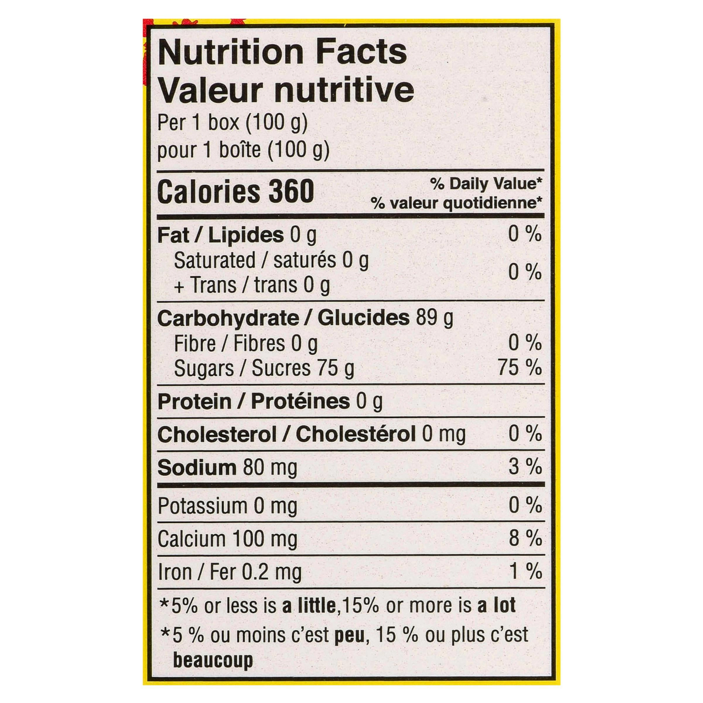 Sugars (sugar, glucose syrup), Modified corn starch, Tartaric acid, Lactic acid, Citric acid, Artificial flavour, Allura red, Brilliant blue FCF, Sunset yellow FCF, Tartrazine.