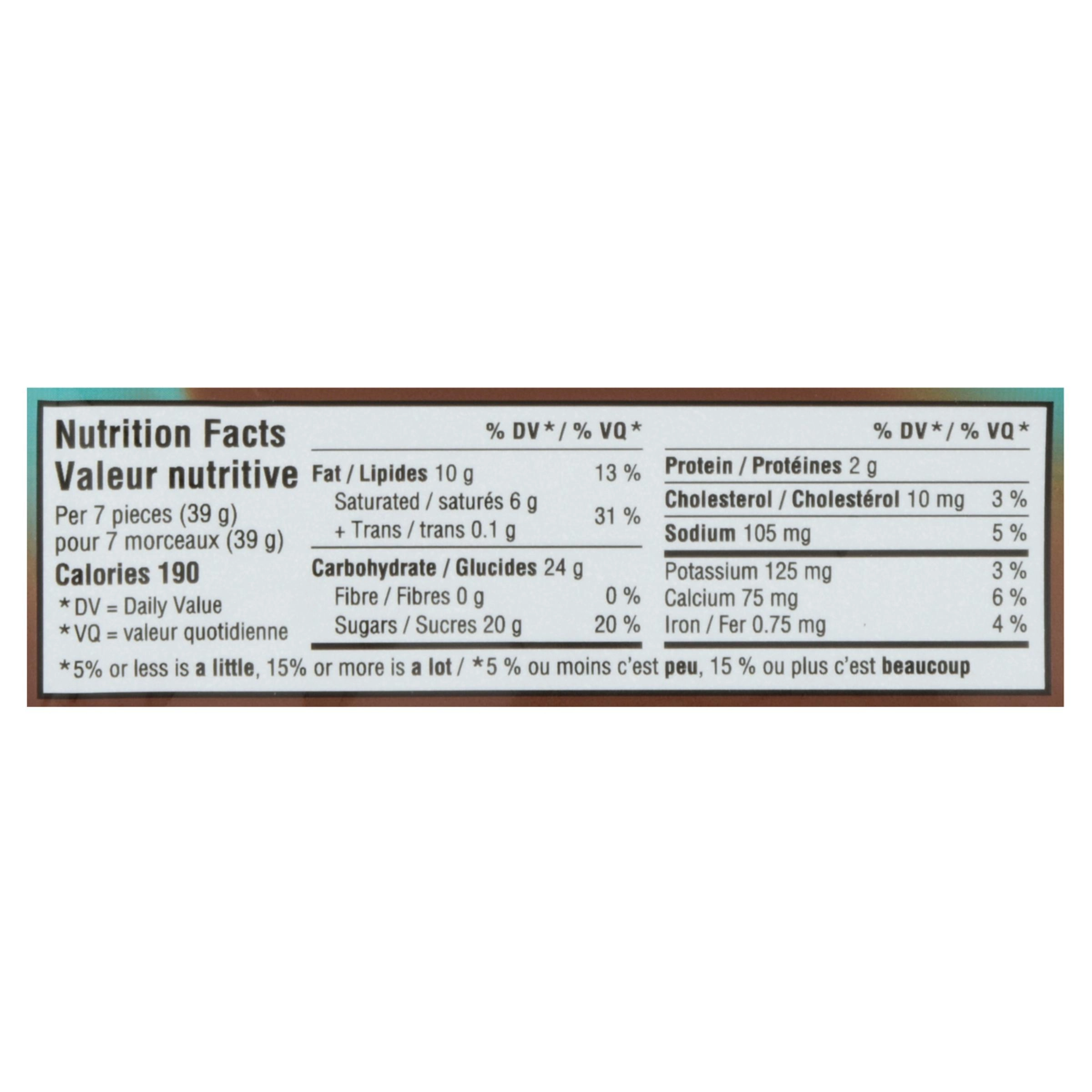 Prepared in Canada, this family bar is made with 100% sustainably sourced cocoa, supporting responsible farming and helping fight deforestation. Cadbury’s Cocoa Life program ensures that every bar you enjoy does good by encouraging sustainable cocoa farming and supporting cocoa farming communities. Learn more about our commitment to sustainability at Cocoalife.org.