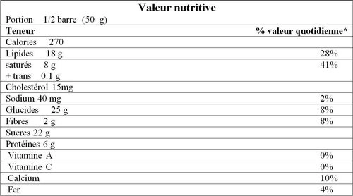 – Milk chocolate [sugar, milk ingredients, cocoa butter, unsweetened chocolate, lecithin (soy), polyglycerol polyricinoleate, natural flavour]
