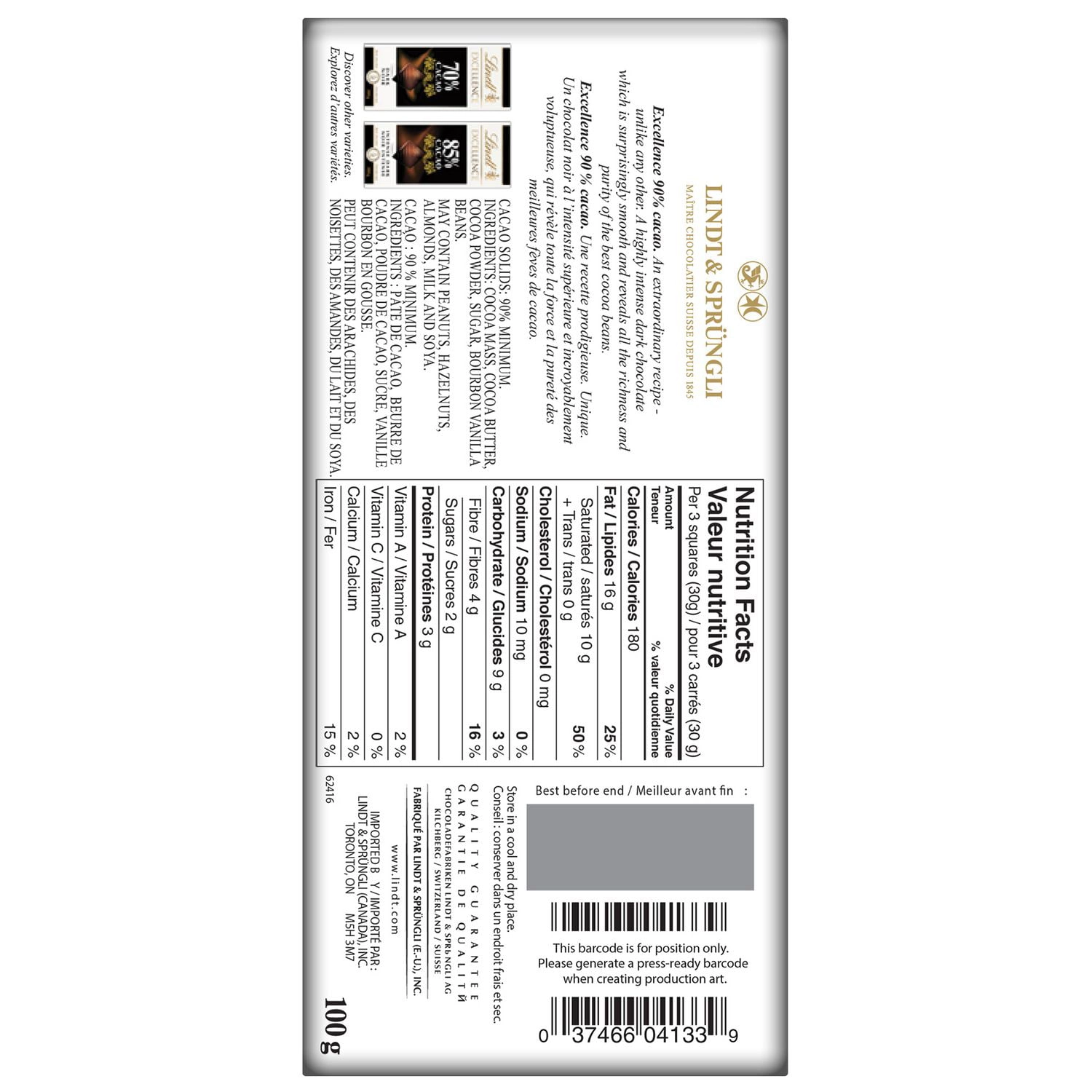 Indulge your senses with the Lindt Excellence 90% Cacao Dark Chocolate Bar. Crafted by Lindt Maître Chocolatiers, this gourmet dark chocolate bar is made with 90% cacao, offering smoky notes of firewood, leather, and roasted coffee. With a full-bodied finish that lingers on your palate, this dark chocolate bar is a true delight for chocolate lovers.