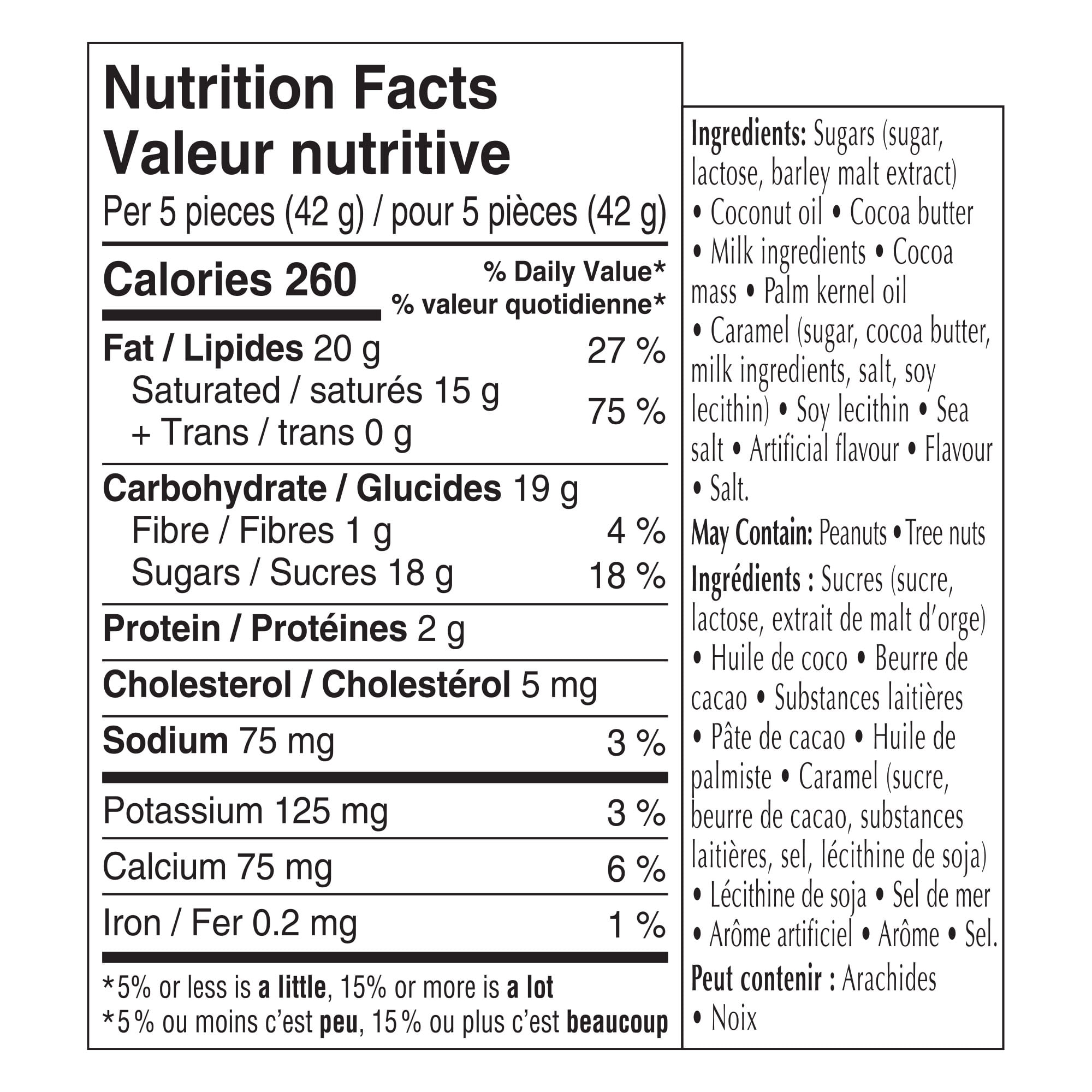 | Ingredients | Sugars (sugar, lactose, barley malt extract), Coconut oil, Cocoa butter, Milk ingredients, Cocoa mass, Palm kernel oil, Caramel (sugar, cocoa butter, milk ingredients, salt, soy, lecithin), Soy lecithin, Sea salt, Artificial flavor, Flavor, Salt. May contain: Peanuts, Tree nuts |