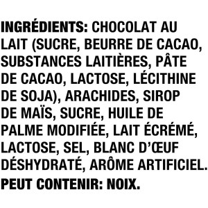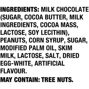| Ingredients | Milk Chocolate (sugar, cocoa butter, milk ingredients, cocoa mass, lactose, soy lecithin), peanuts, corn syrup, sugar, modified palm oil, skim milk, lactose, salt, dried egg-white, artificial flavor. May contain: tree nuts. |