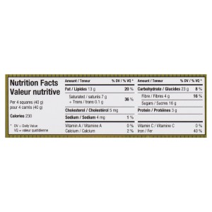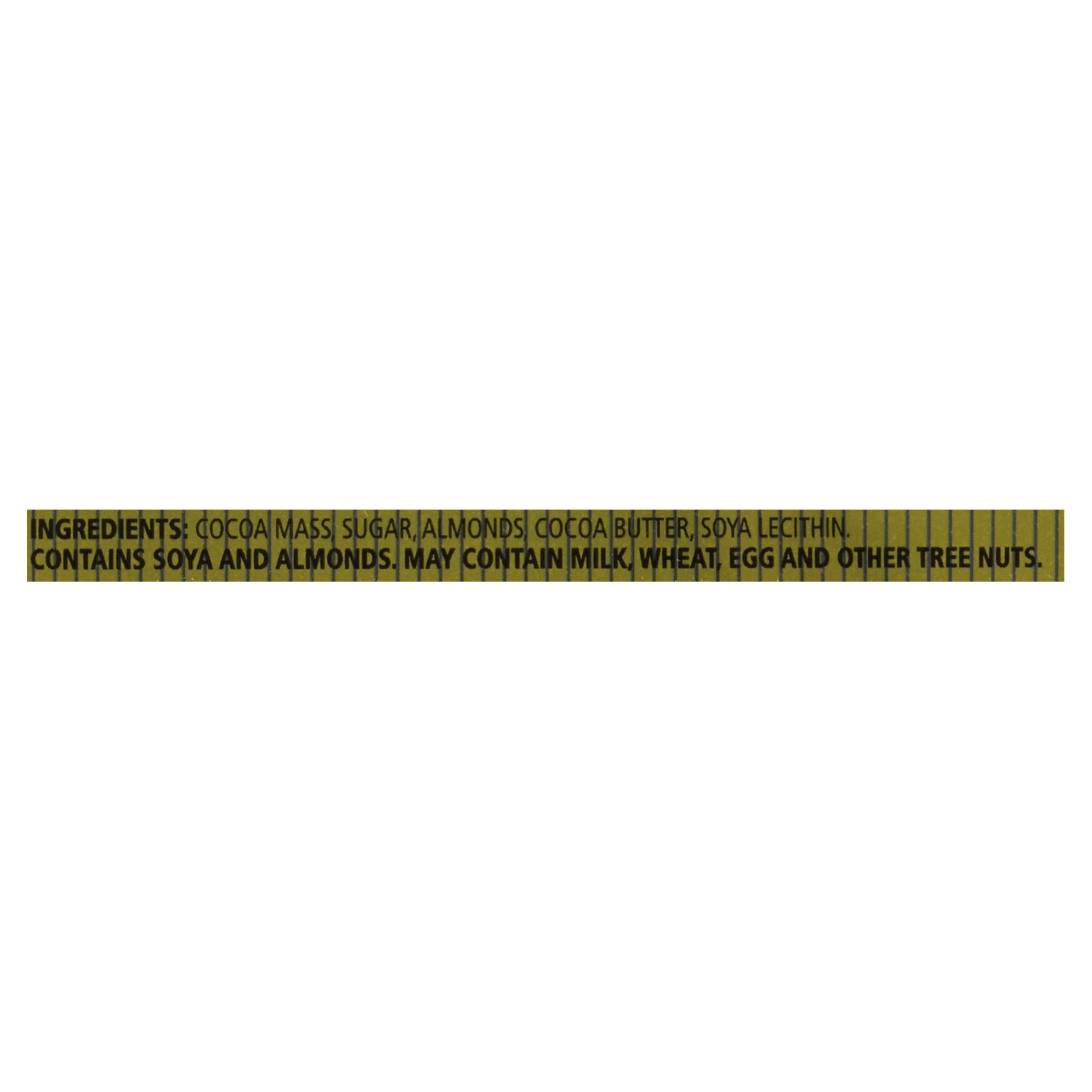 – Ingredients: Cocoa mass, sugar, almonds, cocoa butter, soya lecithin