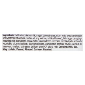 - Mini eggs candy (sugar, modified milk ingredients, cocoa butter, unsweetened chocolate, modified palm and modified vegetable oil, soy lecithin, titanium dioxide, gum arabic, artificial flavor, carnauba wax, beeswax, shellac, tartrazine, brilliant blue FCF, allura red)