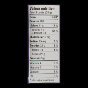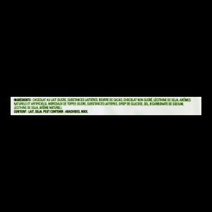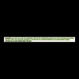 - MILK CHOCOLATE (SUGAR, MILK INGREDIENTS, COCOA BUTTER, UNSWEETENED CHOCOLATE, SOY LECITHIN, NATURAL AND ARTIFICIAL FLAVOURS)