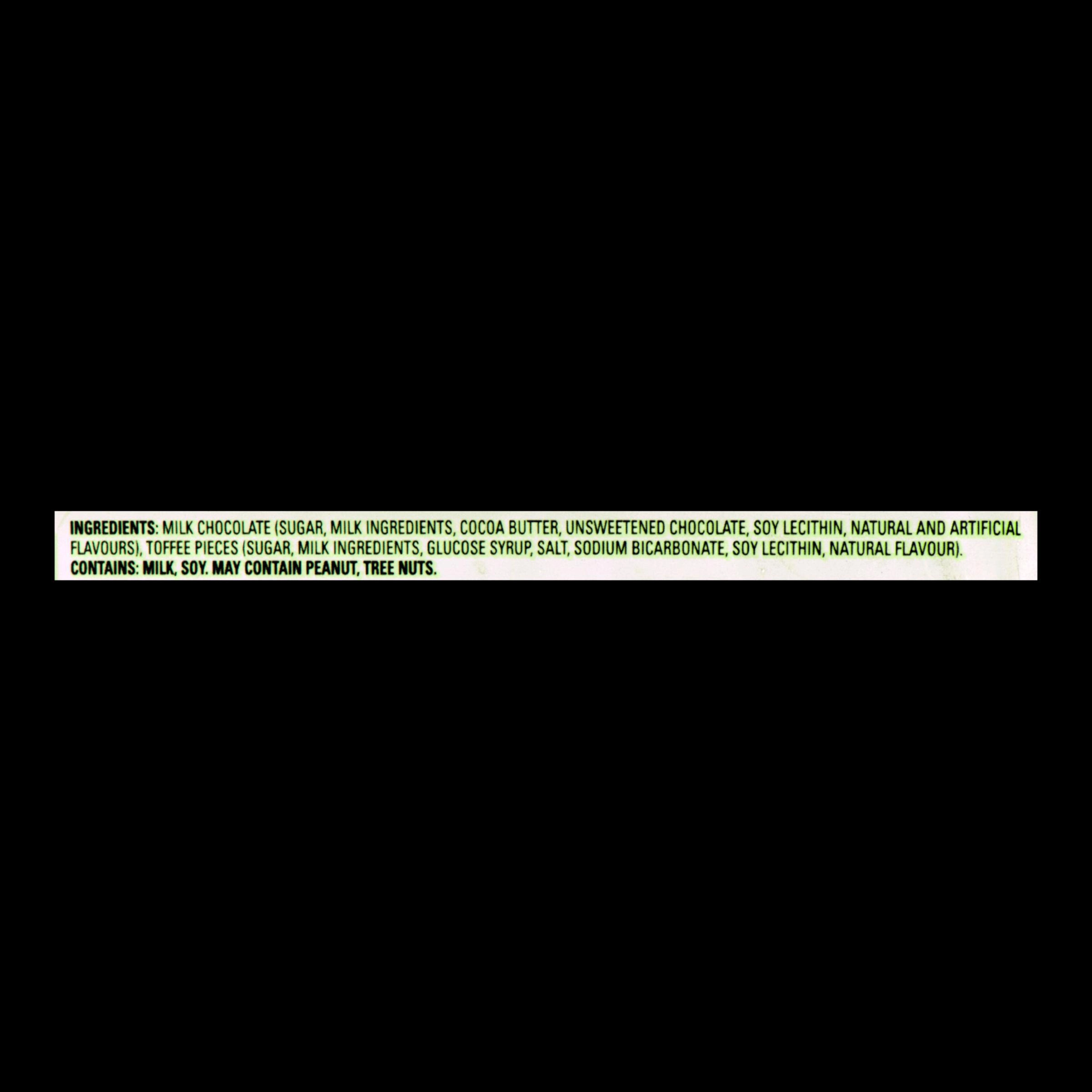- TOFFEE PIECES (SUGAR, MILK INGREDIENTS, GLUCOSE SYRUP, SALT, SODIUM BICARBONATE, SOY LECITHIN, NATURAL FLAVOUR)