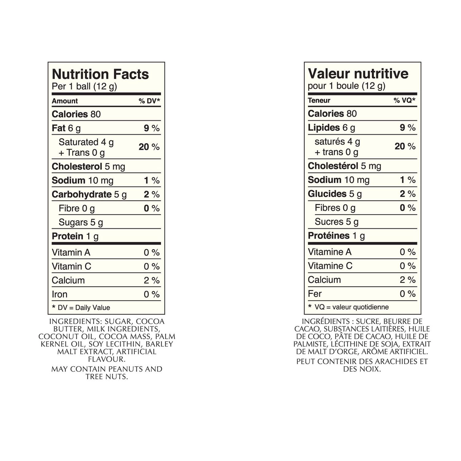 | Ingredients | Sugar, cocoa butter, milk ingredients, coconut oil, cocoa mass, palm kernel oil, soy lecithin, barley malt extract, artificial flavor |