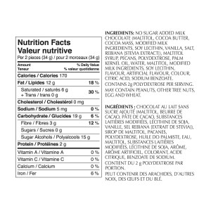 | Ingredients | NO SUGAR ADDED MILK CHOCOLATE (MALTITOL, COCOA BUTTER, COCOA MASS, MODIFIED MILK INGREDIENTS, SOY LECITHIN, VANILLA, SALT, REBIANA [STEVIA EXTRACT]), MALTITOL SYRUP, PECANS, POLYDEXTROSE, PALM KERNEL OIL, WATER, MALTITOL, MODIFIED MILK INGREDIENTS, SOY LECITHIN, FLAVOUR, ARTIFICIAL FLAVOUR, COLOUR, CITRIC ACID, SODIUM BENZOATE. CONTAINS 2 g POLYDEXTROSE PER SERVING. MAY CONTAIN PEANUTS, OTHER TREE NUTS, EGGS, AND WHEAT. |
