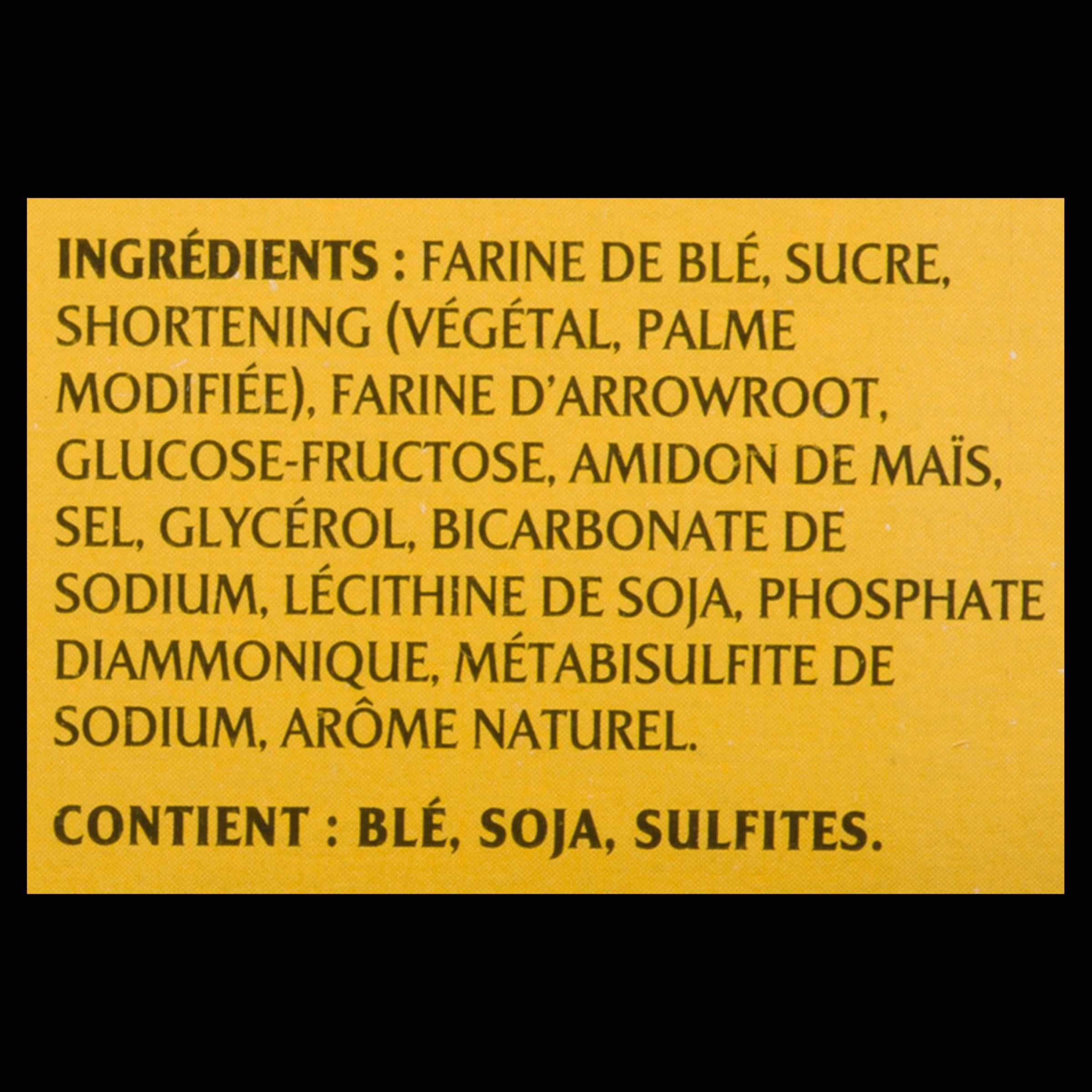 | Ingredients | WHEAT FLOUR, SUGAR, SHORTENING (VEGETABLE, MODIFIED PALM), ARROWROOT FLOUR, GLUCOSE-FRUCTOSE, CORN STARCH, SALT, GLYCEROL, BAKING SODA, SOY LECITHIN, DIAMMONIUM PHOSPHATE, SODIUM METABISULPHITE, NATURAL FLAVOUR |