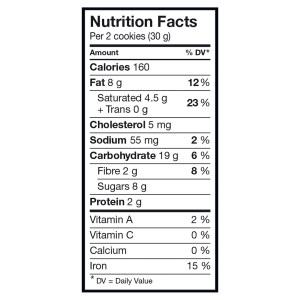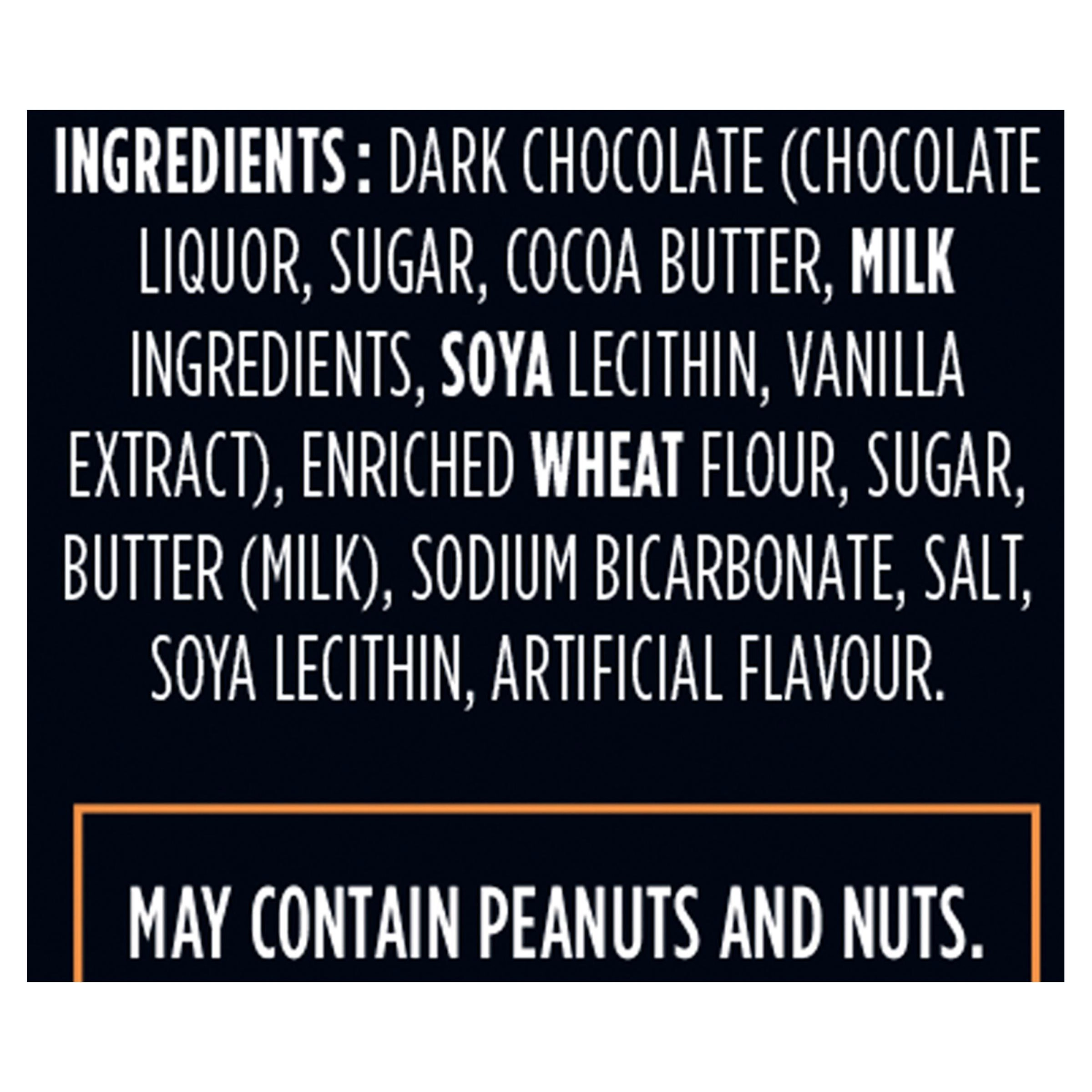 | Ingredients | DARK CHOCOLATE (CHOCOLATE LIQUOR, SUGAR, COCOA BUTTER, MILK INGREDIENTS, SOYA LECITHIN, VANILLA EXTRACT), ENRICHED WHEAT FLOUR, SUGAR, BUTTER (MILK), SODIUM BICARBONATE, SALT, SOYA LECITHIN, ARTIFICIAL FLAVOUR. MAY CONTAIN PEANUTS AND NUTS. |