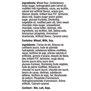 - Confectionery drops (sugar, hydrogenated palm kernel oil, modified milk ingredients, cocoa, soy lecithin, natural and artificial flavour, acacia gum, titanium dioxide, brilliant blue FCF, tartrazine, allura red)