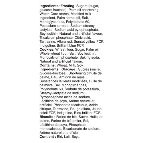 – Frosting: Sugars (sugar, glucose-fructose), Palm oil shortening, Water, Corn starch, Modified milk ingredient, Palm kernel oil, Salt, Monoglycerides, Polysorbate 60, Potassium sorbate, Sodium stearoyl lactylate, Sodium acid pyrophosphate, Soy lecithin, Natural and artificial flavor, Tricalcium phosphate, Citric acid, Tartrazine, Allura red, Sunset yellow FCF, Indigotine, Brilliant blue FCF