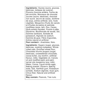 | Serving Size: 100g | Sugars (sugar, glucose, dextrose, cooking molasses), Whole rolled oats, Enriched wheat flour, Chocolate chunks [sugars (sugar, dextrose), unsweetened chocolate, cocoa butter, soy lecithin, artificial flavour, milk], Vegetable oil, Canola oil and modified palm and palm kernel oils margarine (soy, milk), Water, Cocoa, Liquid whole eggs, Baking powder, Glycerin, Baking soda, Salt, Xanthan gum, Potassium sorbate, Sodium alginate, Guar gum, Citrus fiber, Natural and artificial flavour. May contain: Peanuts, Tree nuts. | Shelf | No |