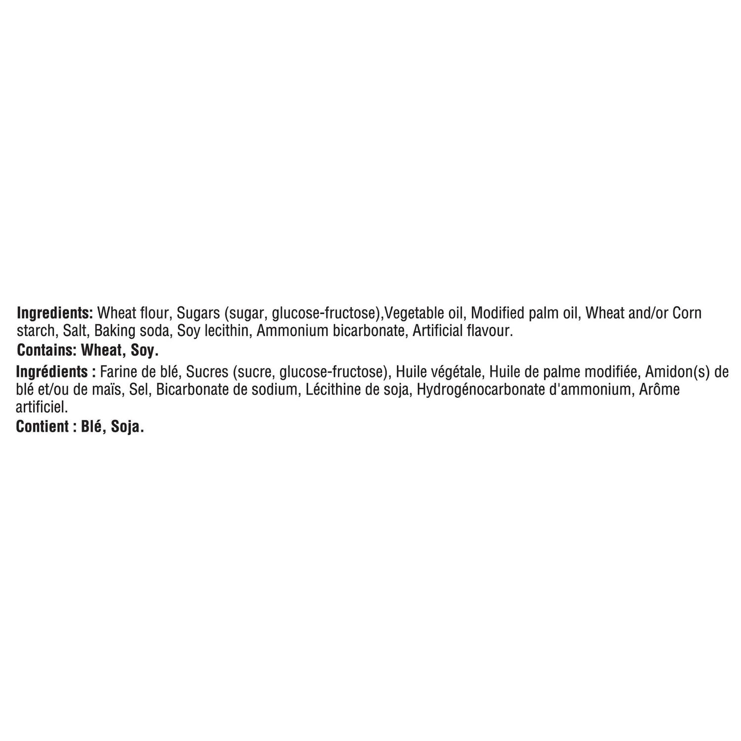 – Ingredients: Wheat flour, sugars (sugar, glucose-fructose), vegetable oil, modified palm oil, wheat and/or corn starch, salt, baking soda, soy lecithin, ammonium bicarbonate, artificial flavor