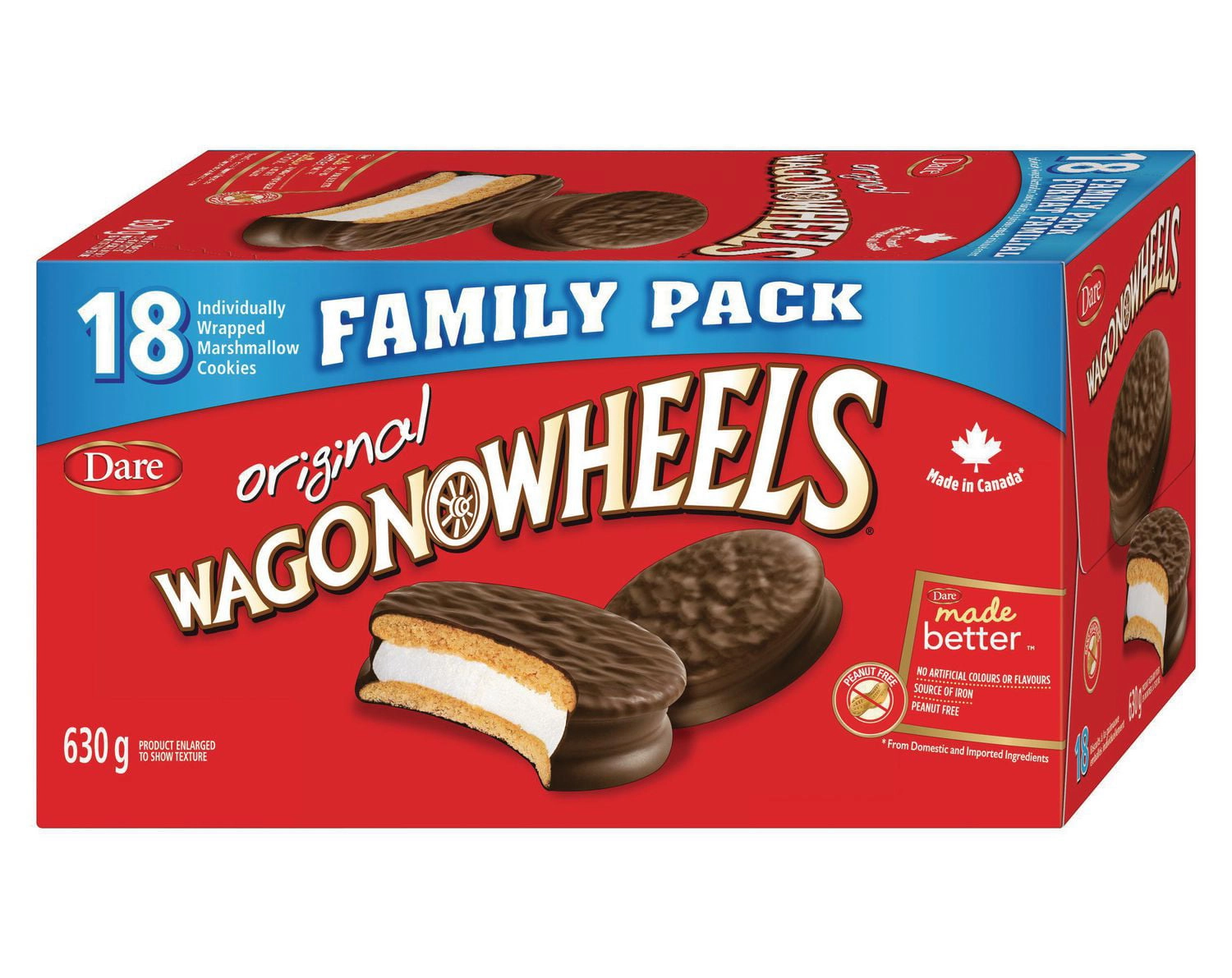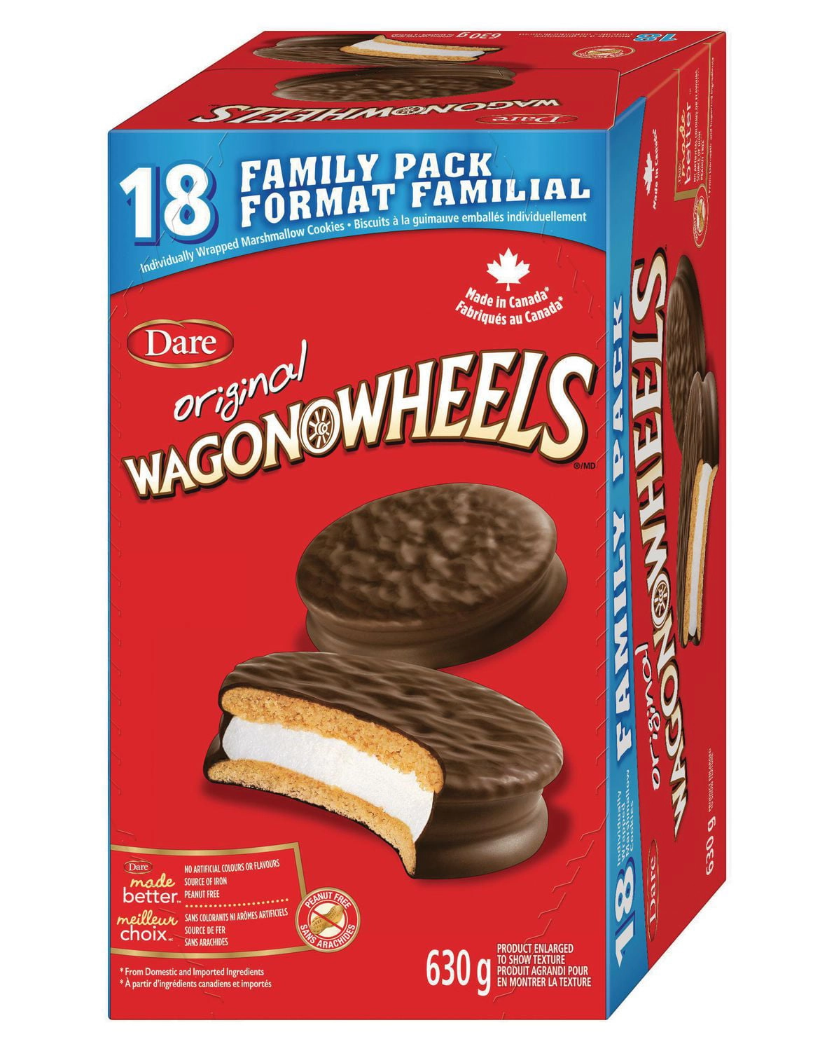 Experience the exhilaration of Wagon Wheels Cookies! These delicious treats are the perfect combination of layered soft cookies, fluffy marshmallows, and a chocolatey coating. Individually wrapped for freshness, they are ideal for packing in lunch boxes or enjoying on the go. Made by Dare, a proudly Canadian company, these cookies are peanut-free and made with no artificial colors or flavors. Grab a pack of Wagon Wheels Cookies and indulge in a nostalgic treat that will satisfy your sweet tooth.