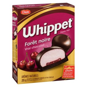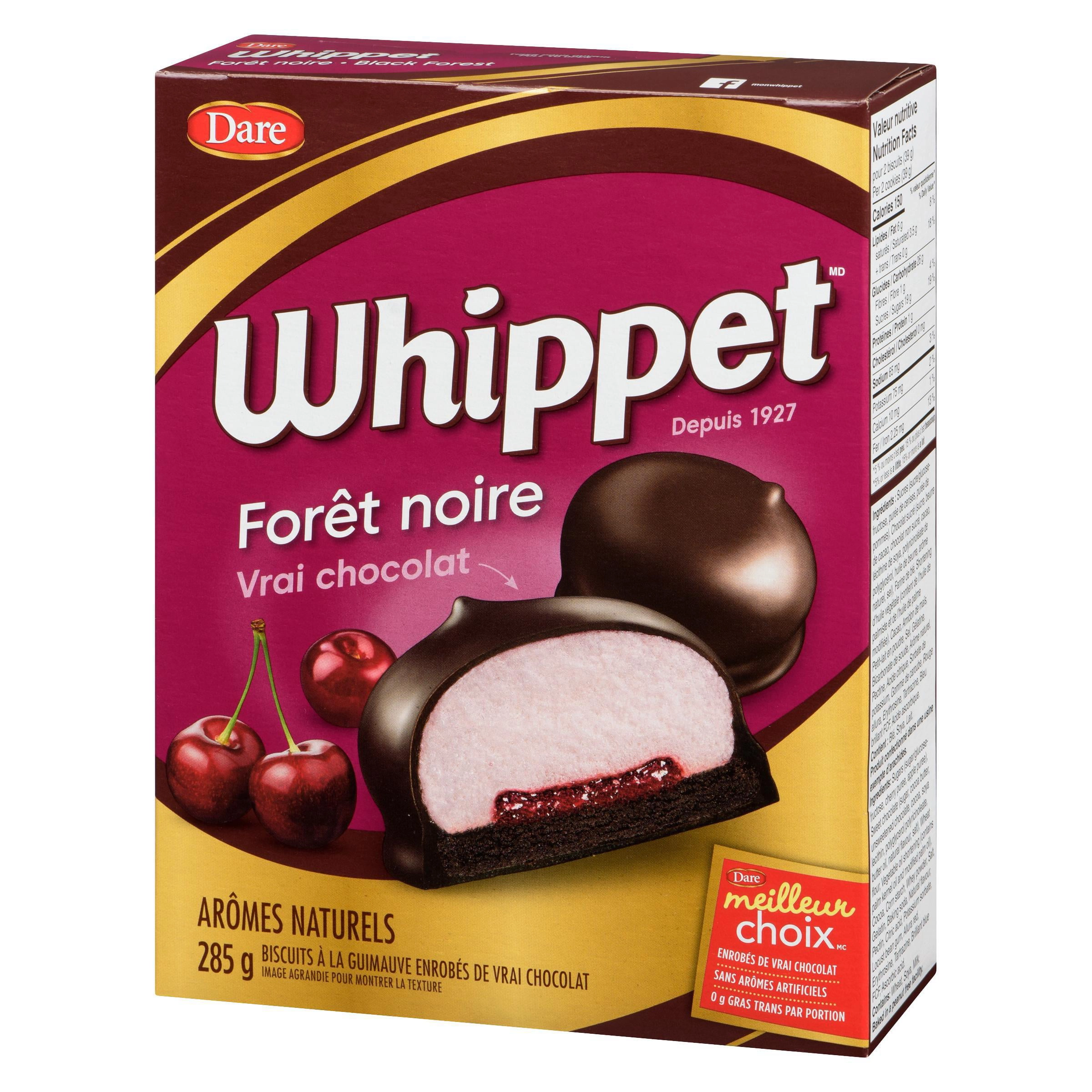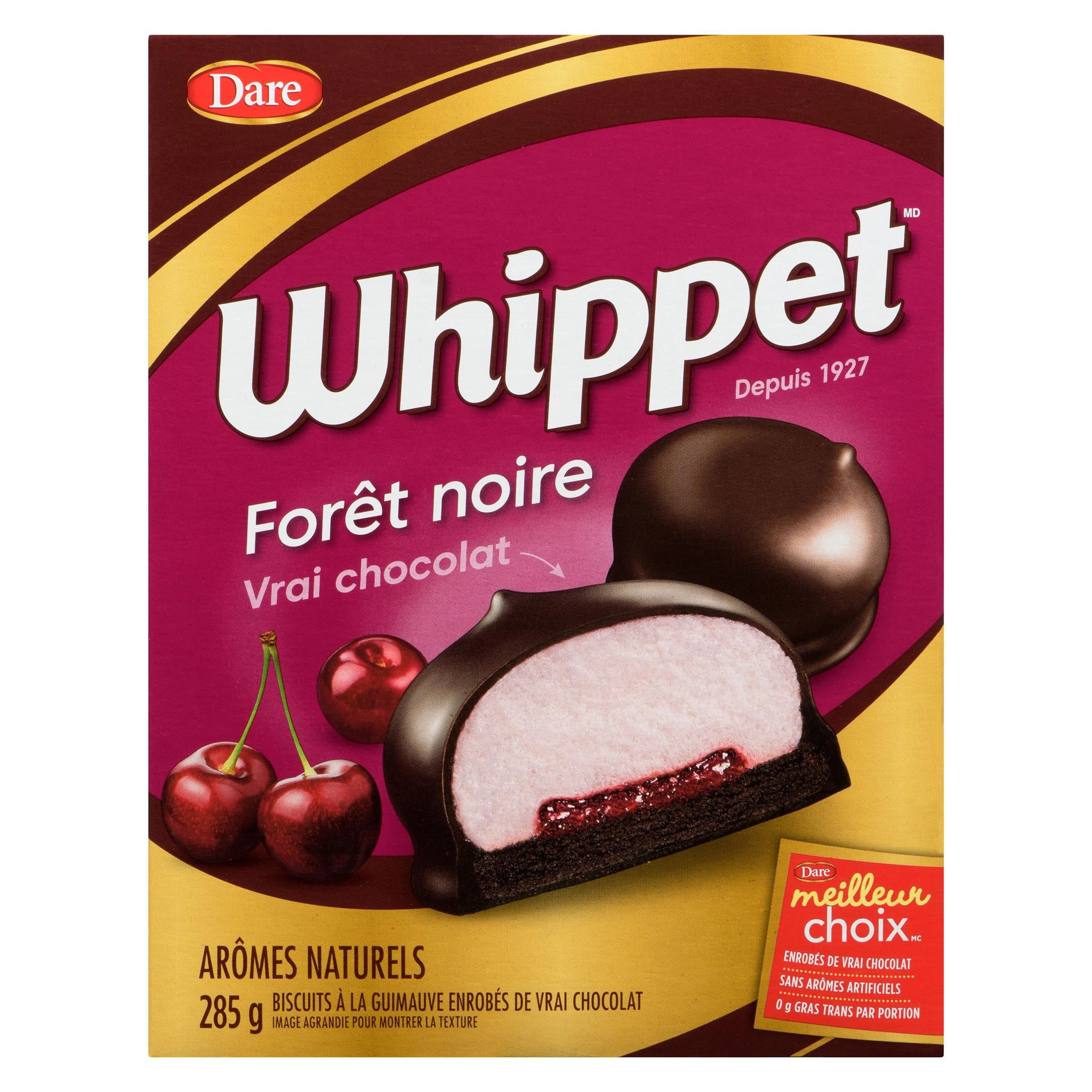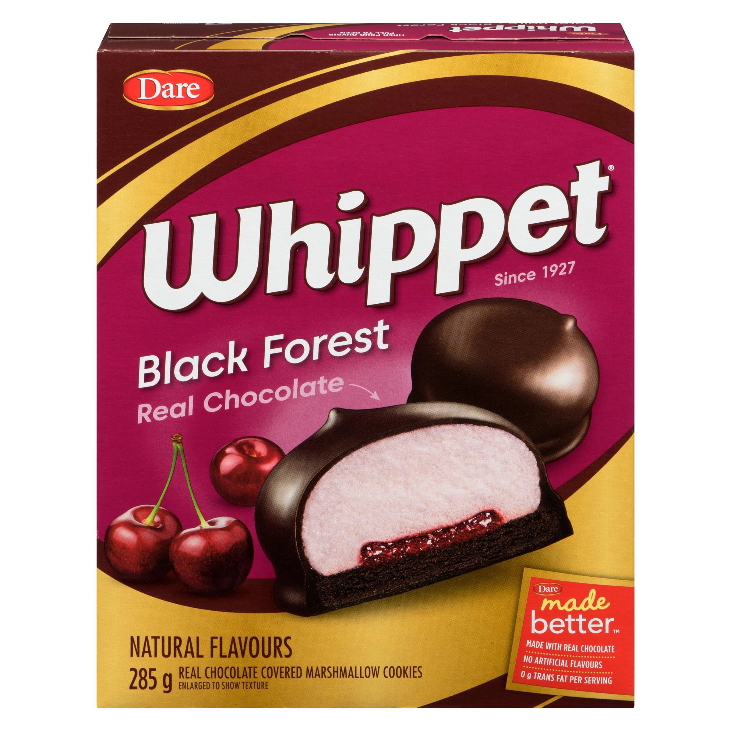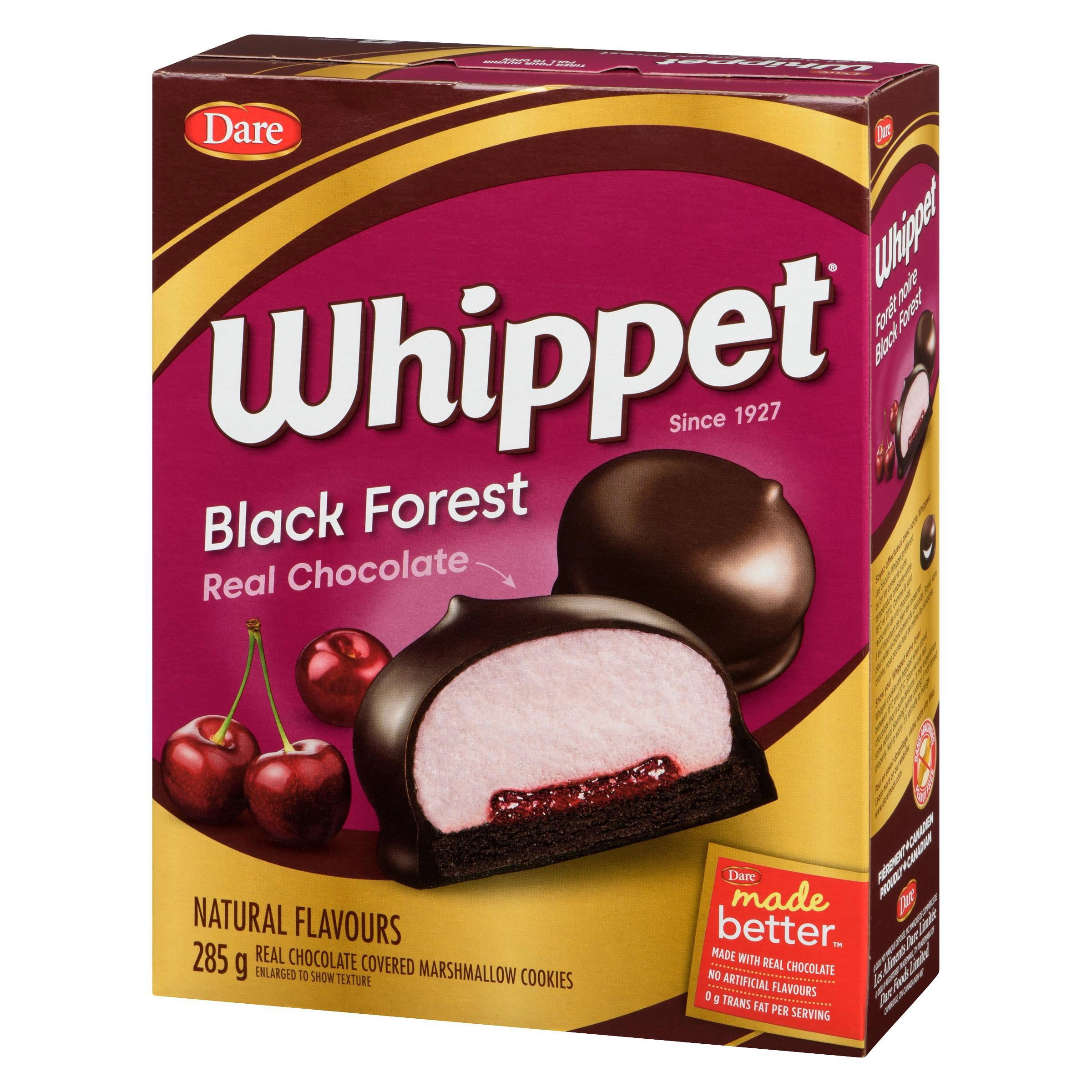 Indulge in the irresistible Whippet Black Forest Chocolate Covered Mashmallow Cookies. These decadent treats feature a chewy marshmallow with a rich cherry center, a soft cookie base, and a real chocolate coating. Perfect for satisfying your sweet tooth, these cookies are the ultimate after-dinner delight.