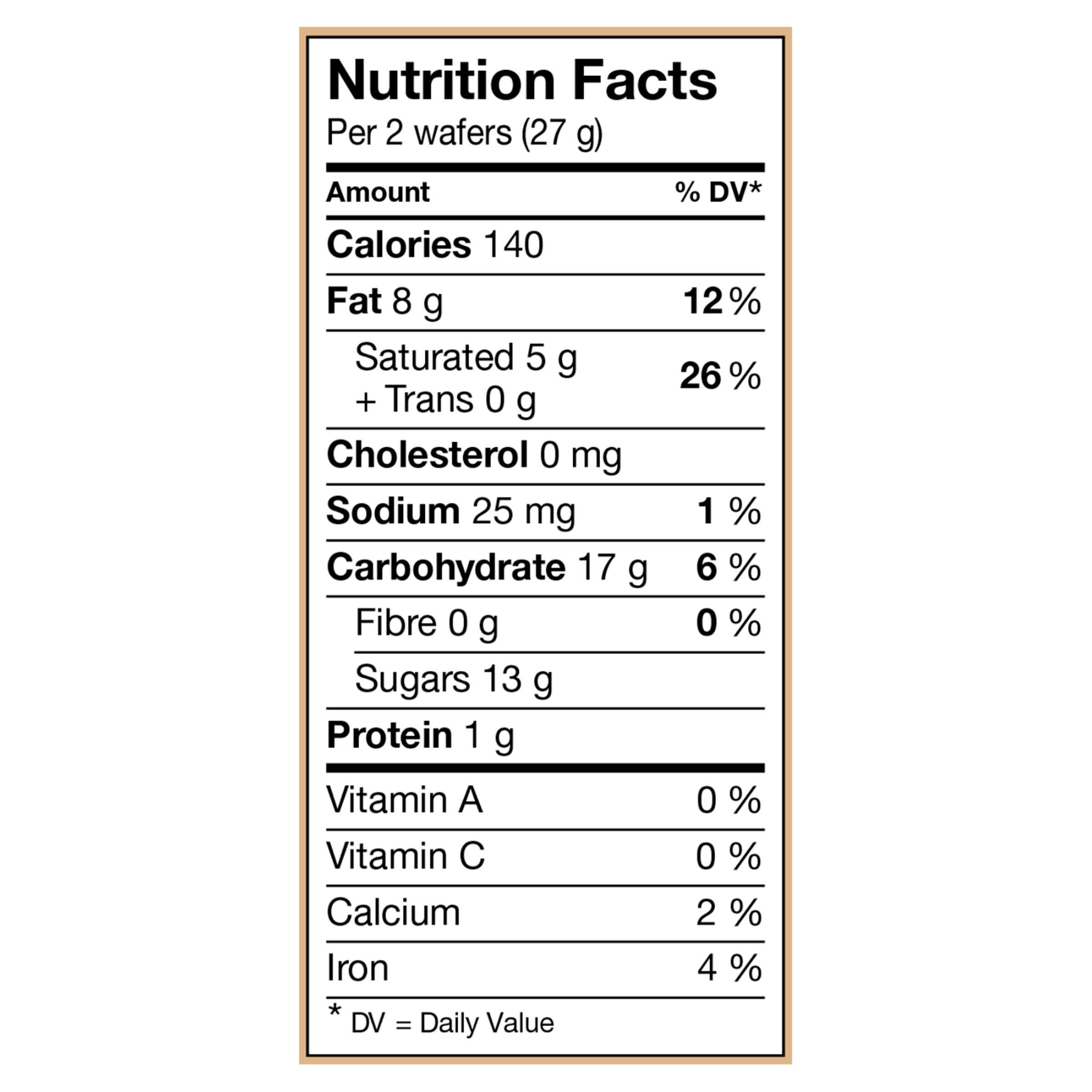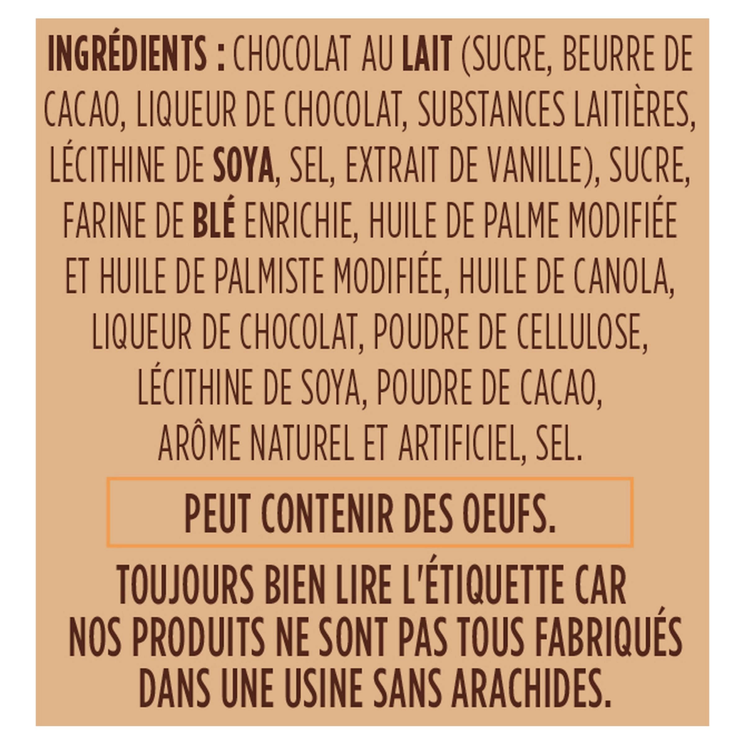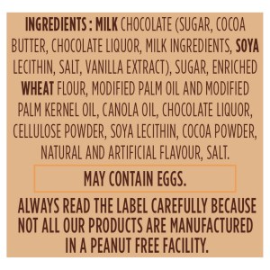 Milk Chocolate (Sugar, Cocoa Butter, Chocolate Liquor, Milk Ingredients, Soya Lecithin, Salt, Vanilla Extract), Sugar, Enriched Wheat Flour, Modified Palm Oil and Modified Palm Kernel Oil, Canola Oil, Chocolate Liquor, Cellulose Powder, Soya Lecithin, Cocoa Powder, Natural and Artificial Flavor, Salt. May Contain Eggs. Always read the label carefully because not all our products are manufactured in a peanut-free facility.