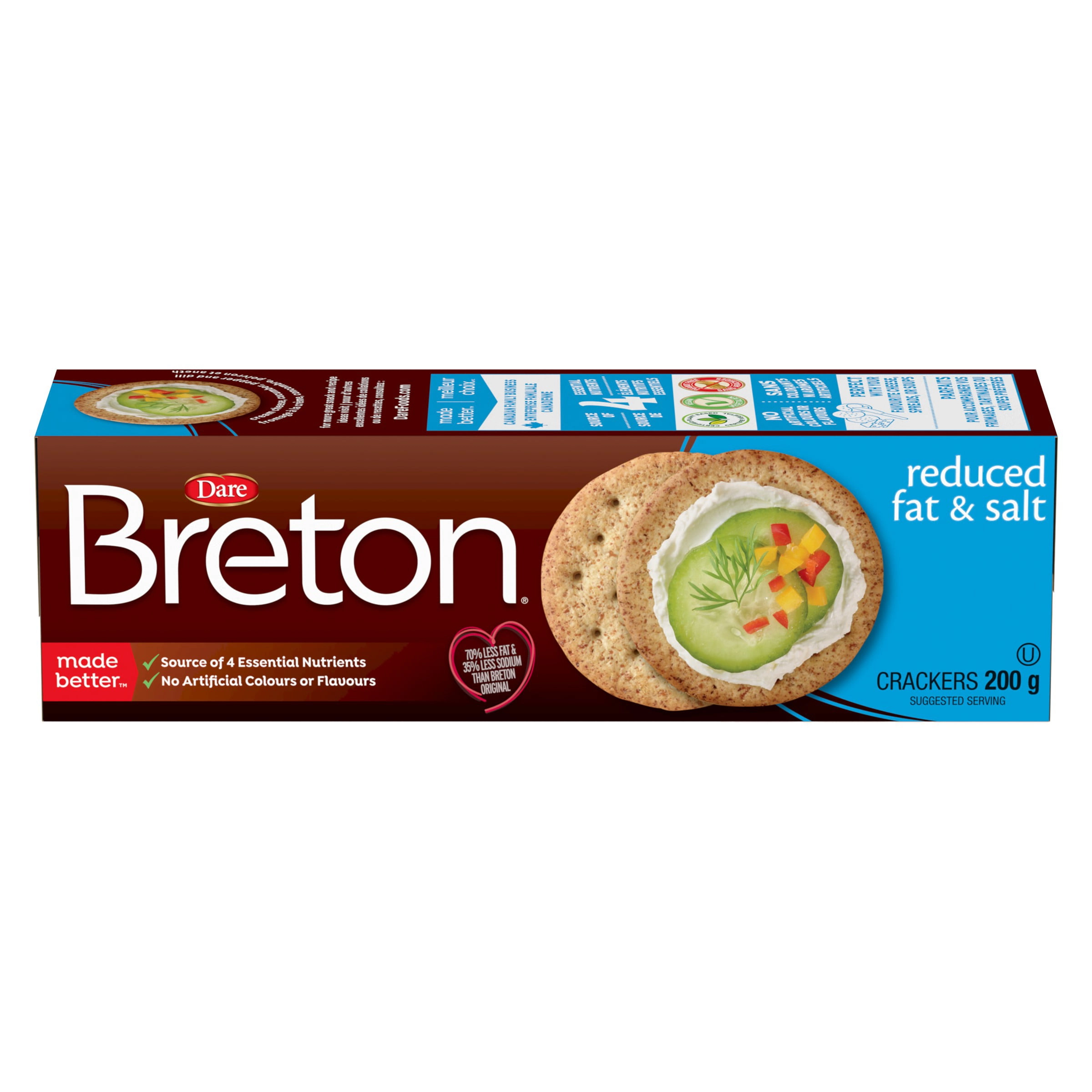 - 70% less fat and 35% less sodium than Breton Originals