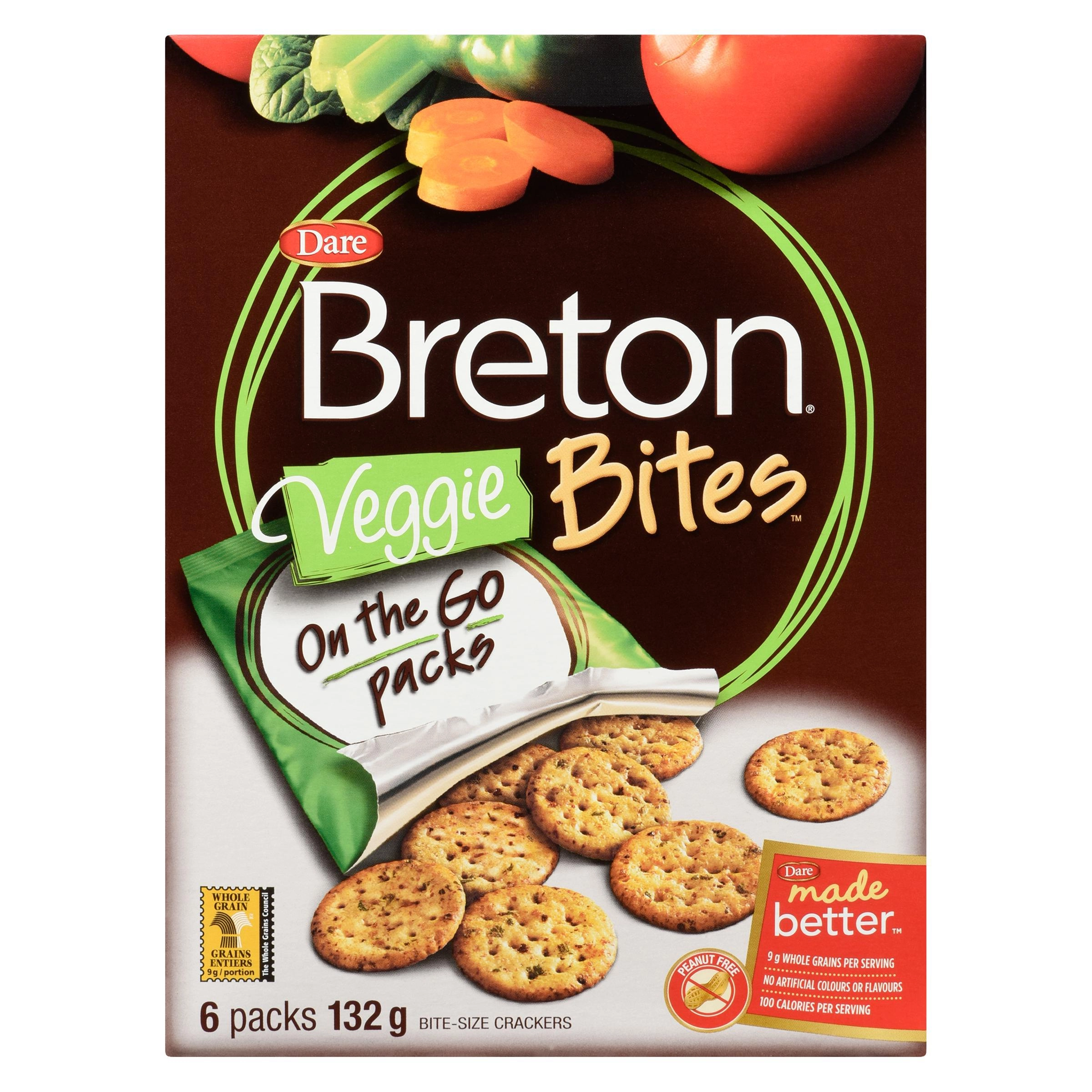 WHOLE GRAIN WHOLE WHEAT FLOUR, WHEAT FLOUR, VEGETABLE OIL, SUGAR, DEHYDRATED VEGETABLE BLEND OF CARROT, ONION, CELERY, TOMATO, RED AND GREEN PEPPER, GARLIC, BROCCOLI AND SPINACH, SALT, DEXTROSE, CORN STARCH, MALTODEXTRIN, WHEY POWDER, AMMONIUM BICARBONATE, HYDROLYZED WHEAT, SOYA AND CORN PROTEIN, BAKING SODA, AUTOLYZED YEAST EXTRACT, SPICES, NATURAL FLAVOUR, CALCIUM SILICATE, TBHQ, CITRIC ACID. CONTAINS: WHEAT, SOYA AND MILK. MAY CONTAIN MUSTARD SEEDS AND SESAME SEEDS.