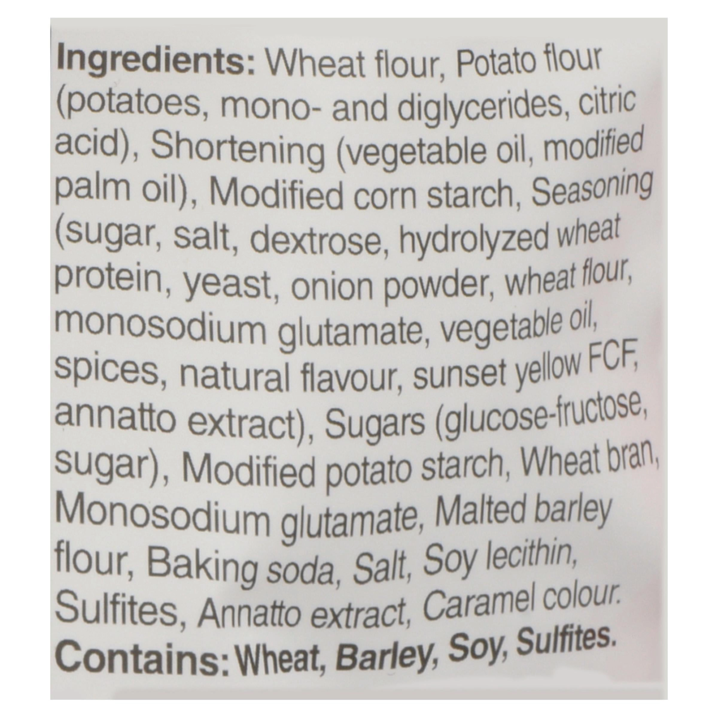 – Seasoning (sugar, salt, dextrose, hydrolyzed wheat protein, yeast, onion powder, wheat flour, monosodium glutamate, vegetable oil, spices, natural flavor, sunset yellow FCF, annatto extract)