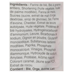 Wheat flour, Whole grain wheat, Shortening (vegetable oil, modified palm oil), Corn flour, Sugars (sugar, barley malt extract, dextrose, glucose syrup), Salt, Oat flour, Cheddar cheese, Autolyzed yeast extract, Vegetable oil, Hydrolyzed wheat protein, Ammonium bicarbonate, Yeast, Baking soda, Onion powder, Monosodium glutamate, Modified milk ingredients, Paprika, Monocalcium phosphate, Vinegar, Diammonium phosphate, Sodium hydroxide, Amylase, Protease, Natural flavor, Caramel color, Sunset yellow FCF, Annatto extract.