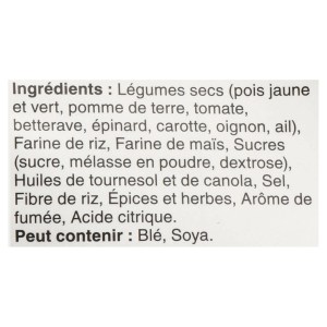 - Dried vegetables (yellow and green pea, potato, tomato, beet, spinach, carrot, onion, garlic)