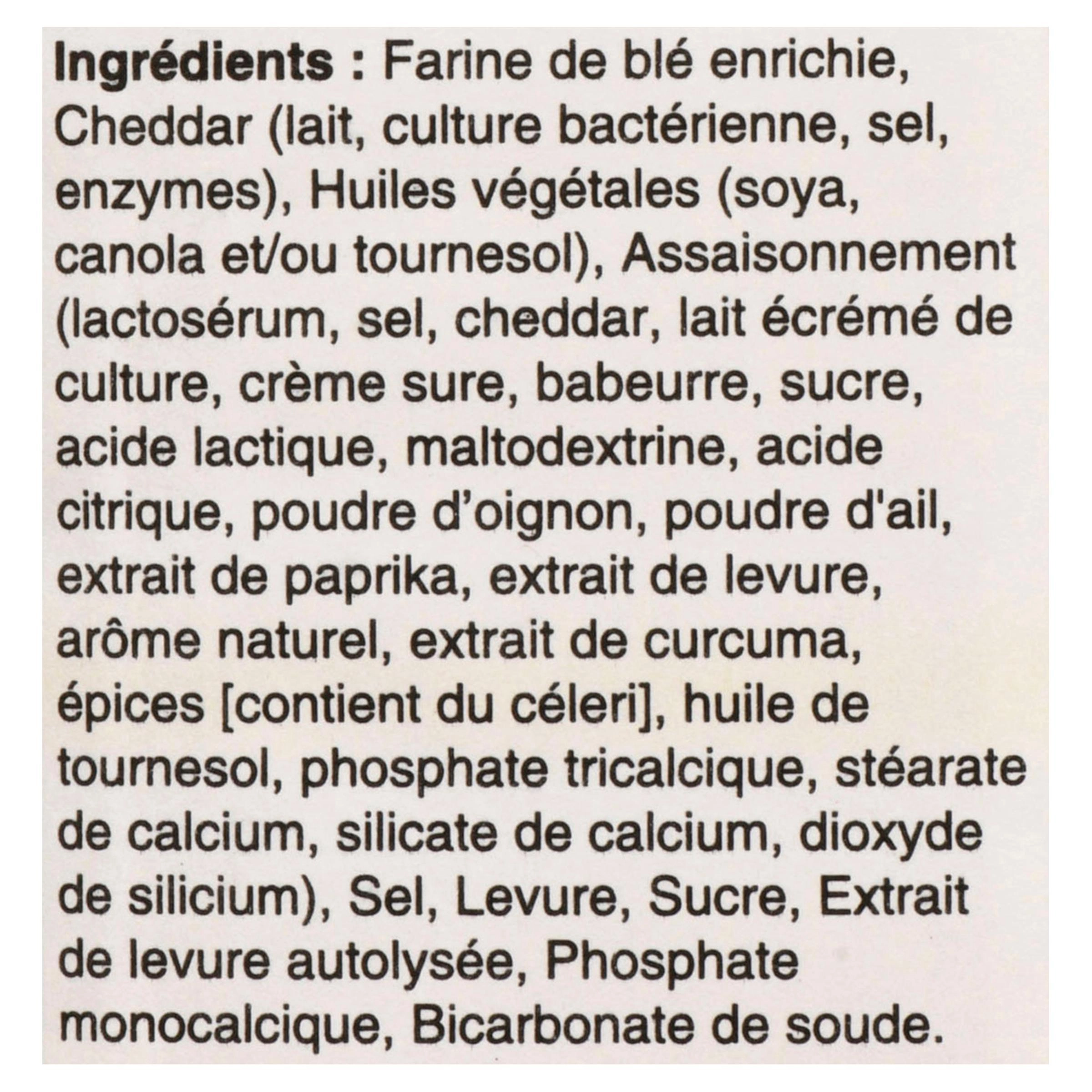 Enriched wheat flour, Cheddar cheese (milk, bacterial culture, salt, enzymes), Vegetable oil (soybean, canola and/or sunflower), Seasoning (whey, salt, cheddar cheese, cultured skim milk, sour cream, buttermilk, sugar, lactic acid, maltodextrin, citric acid, onion powder, garlic powder, paprika extract, yeast extract, natural flavor, turmeric extract, spices [contains celery], sunflower oil, tricalcium phosphate, calcium stearate, calcium silicate, silicon dioxide), Salt, Yeast, Sugar, Autolyzed yeast extract, Monocalcium phosphate, Baking soda.
