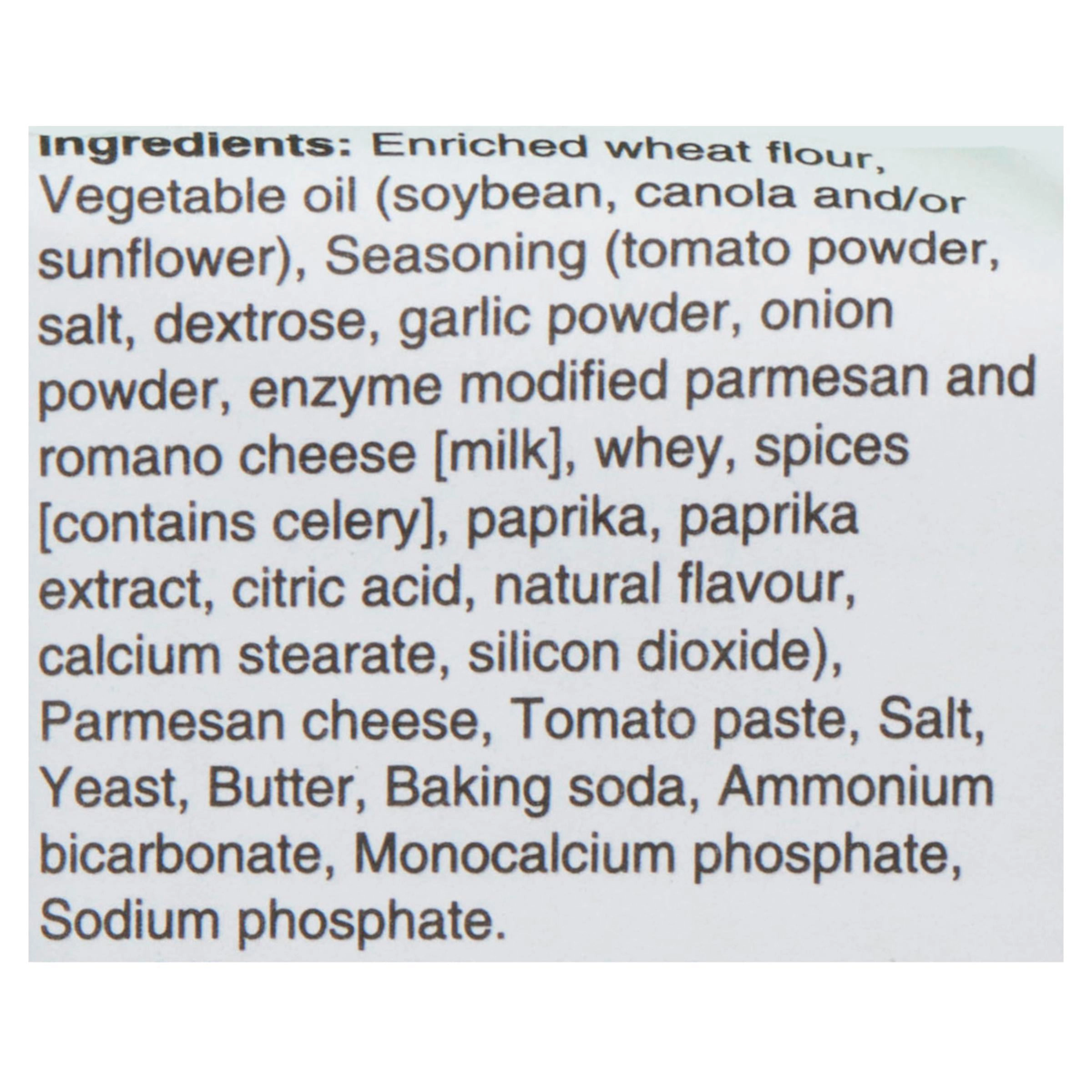 - Seasoning (Dehydrated Tomatoes, Dextrose, Garlic Powder, Onion Powder, Spices [Contains Celery] and Spice Extract, Enzyme Modified Parmesan and Romano Cheese, Whey, Citric Acid)