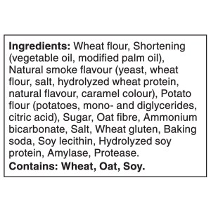 – Ingredients: Wheat flour, Shortening (vegetable oil, modified palm oil), Natural smoke flavor (yeast, wheat flour, salt, hydrolyzed wheat protein, natural flavor, caramel color), Potato flour (potatoes, mono- and diglycerides, citric acid), Sugar, Oat fiber, Ammonium bicarbonate, Salt, Wheat gluten, Baking soda, Soy lecithin, Hydrolyzed soy protein, Amylase, Protease